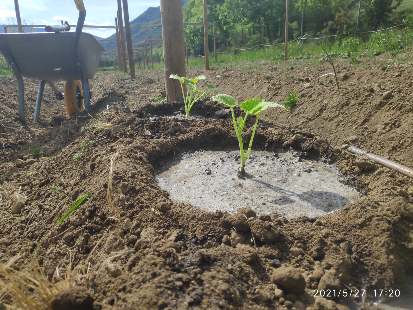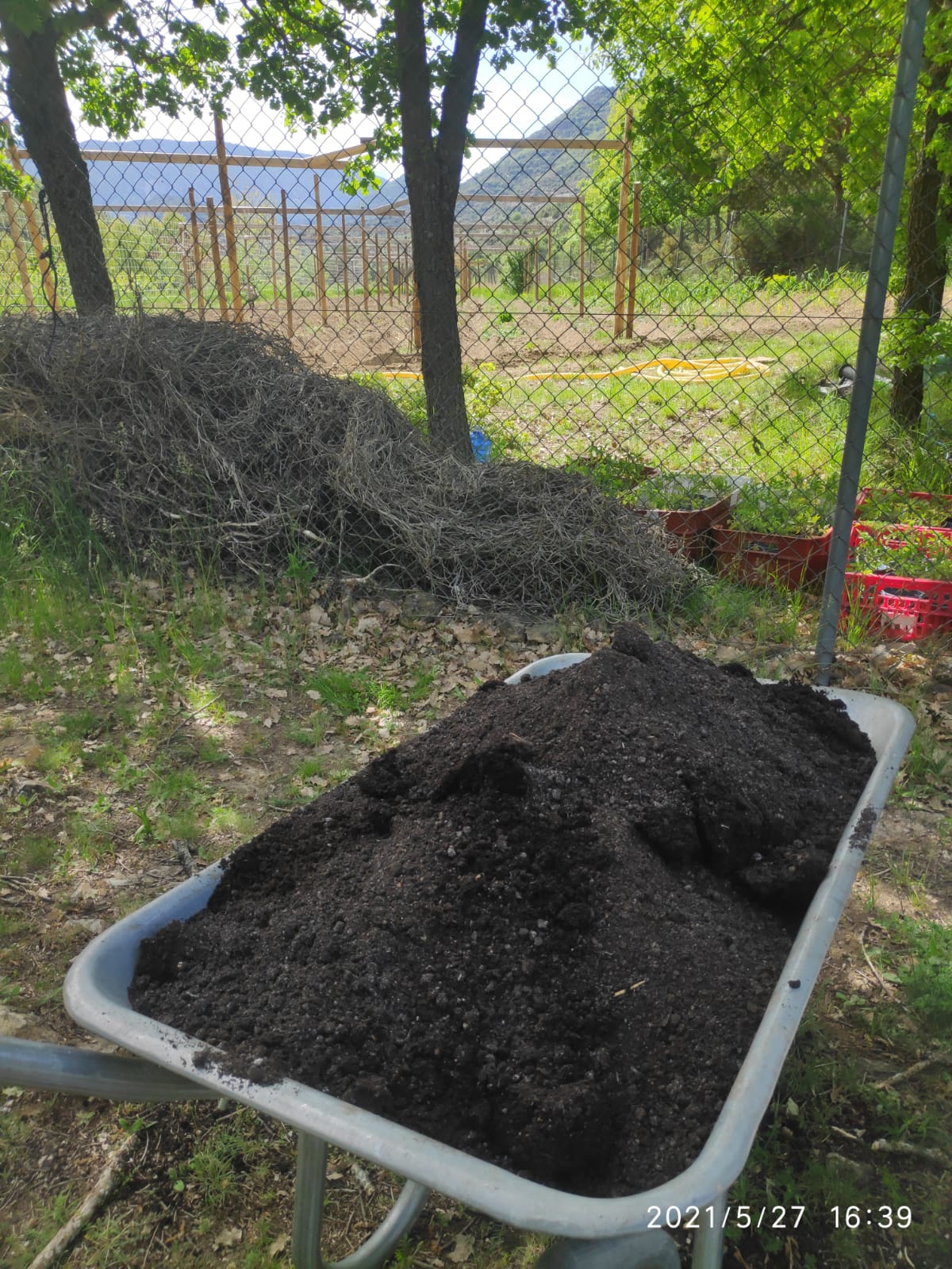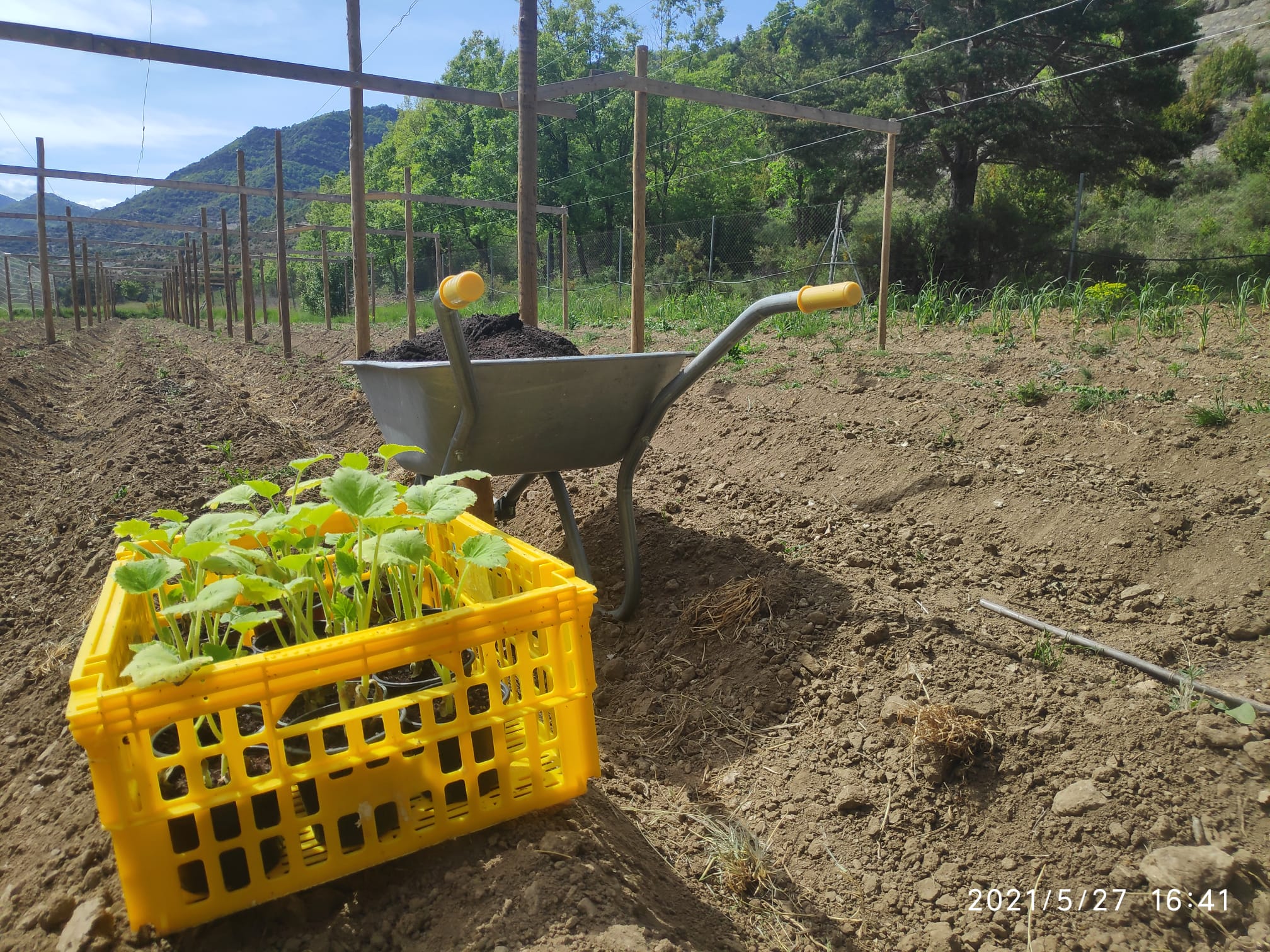 Tras la luna llena, con el buen tiempo de primavera, conseguimos las plantas del invernadero de Nueno, y las plantamos. Para abonarlas, usamos compost de vaca, caballo y oveja ecológico de la Galocha.