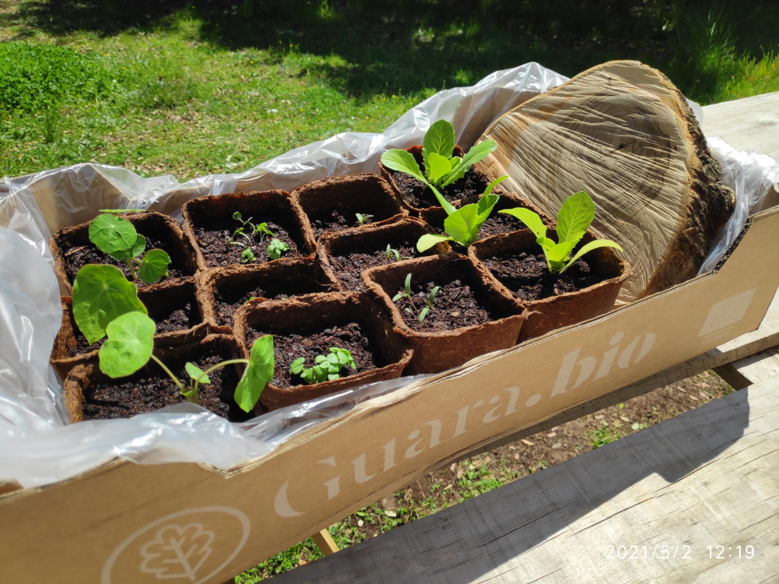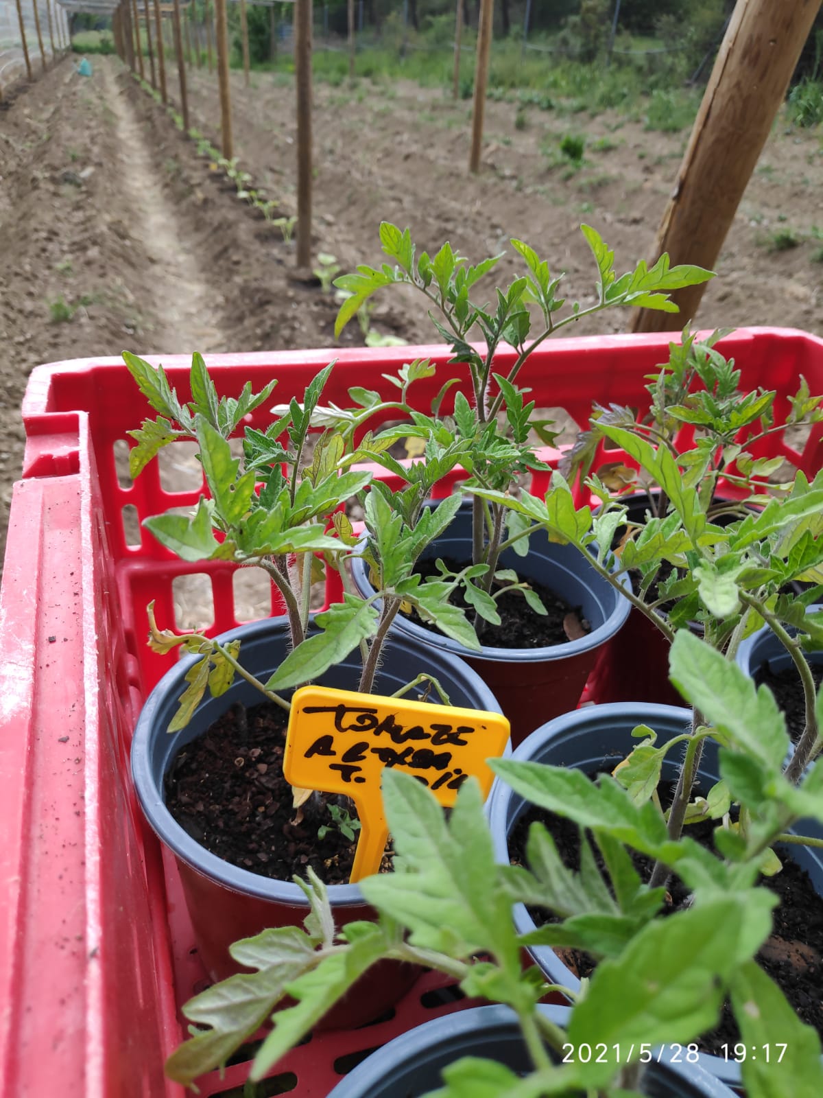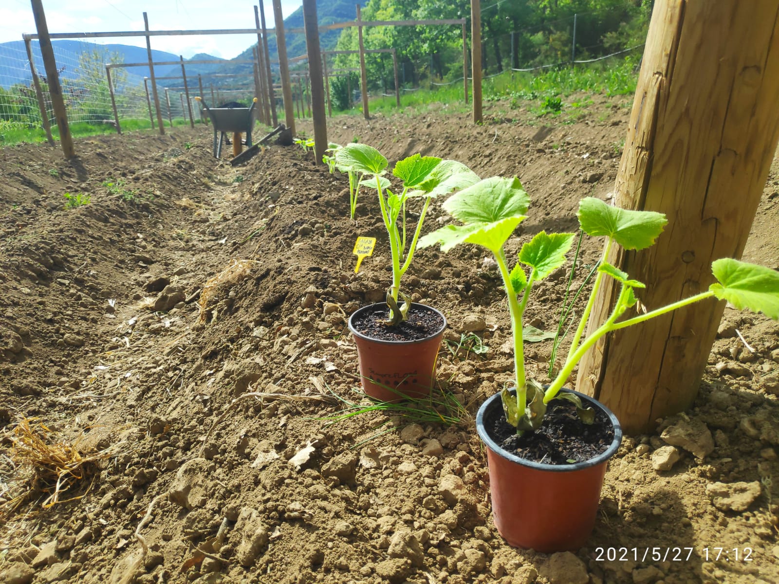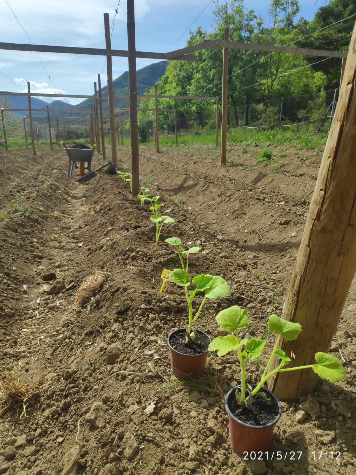 Tras la luna llena, con el buen tiempo de primavera, conseguimos las plantas del invernadero de Nueno, y las plantamos. Para abonarlas, usamos compost de vaca, caballo y oveja ecológico de la Galocha.