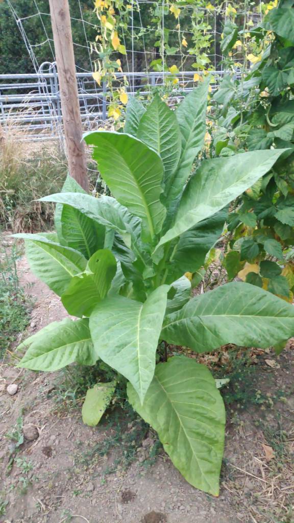 En los alrededores del huerto tenemos alguna planta de tabaco. Es una ayuda para detectar las plagas de pulgón, virus o mosca. Estas plagas se ven muy bien en la planta de tabaco, y nos sirve para prevenir enfermedades en las otros cultivos.