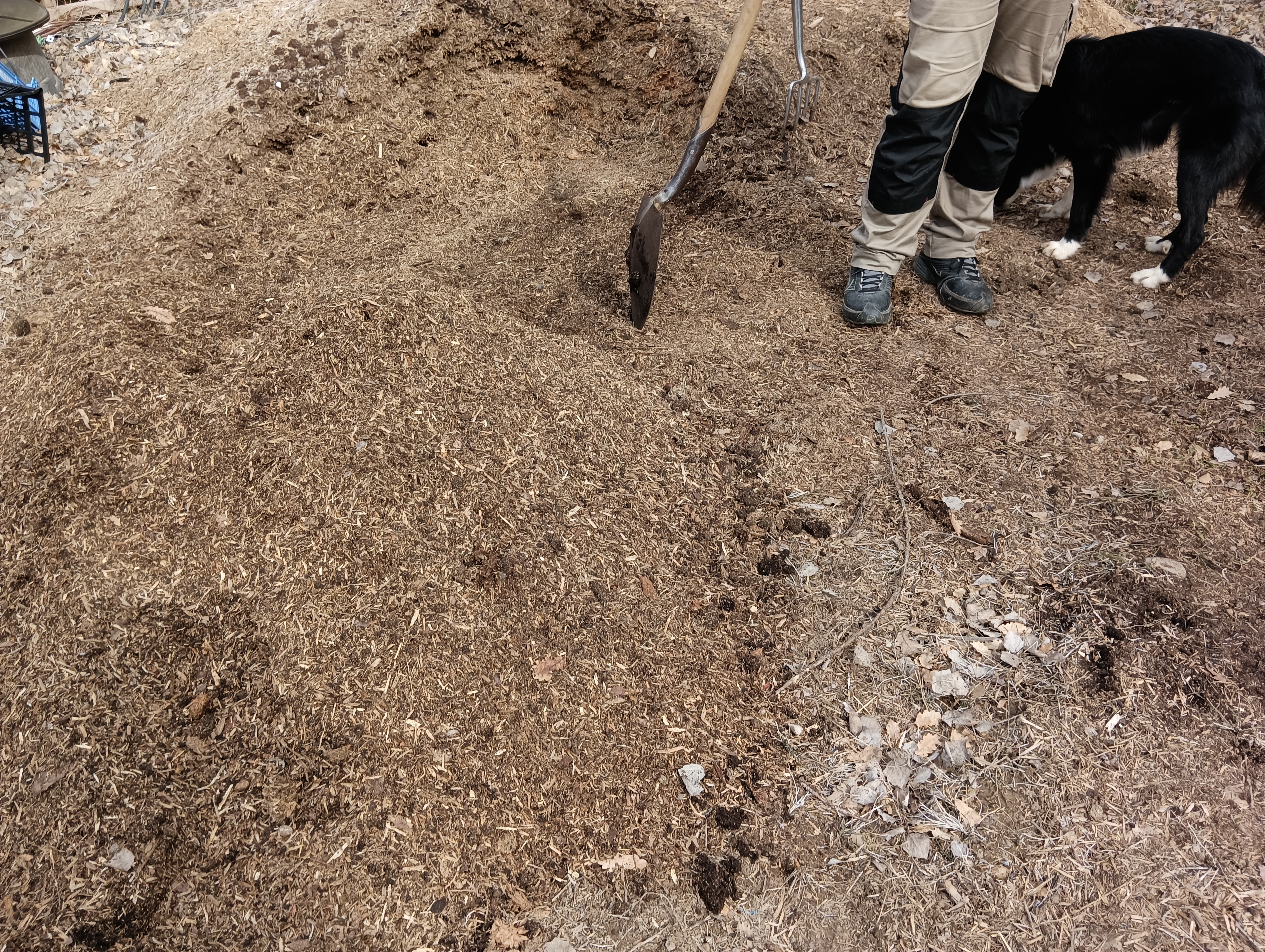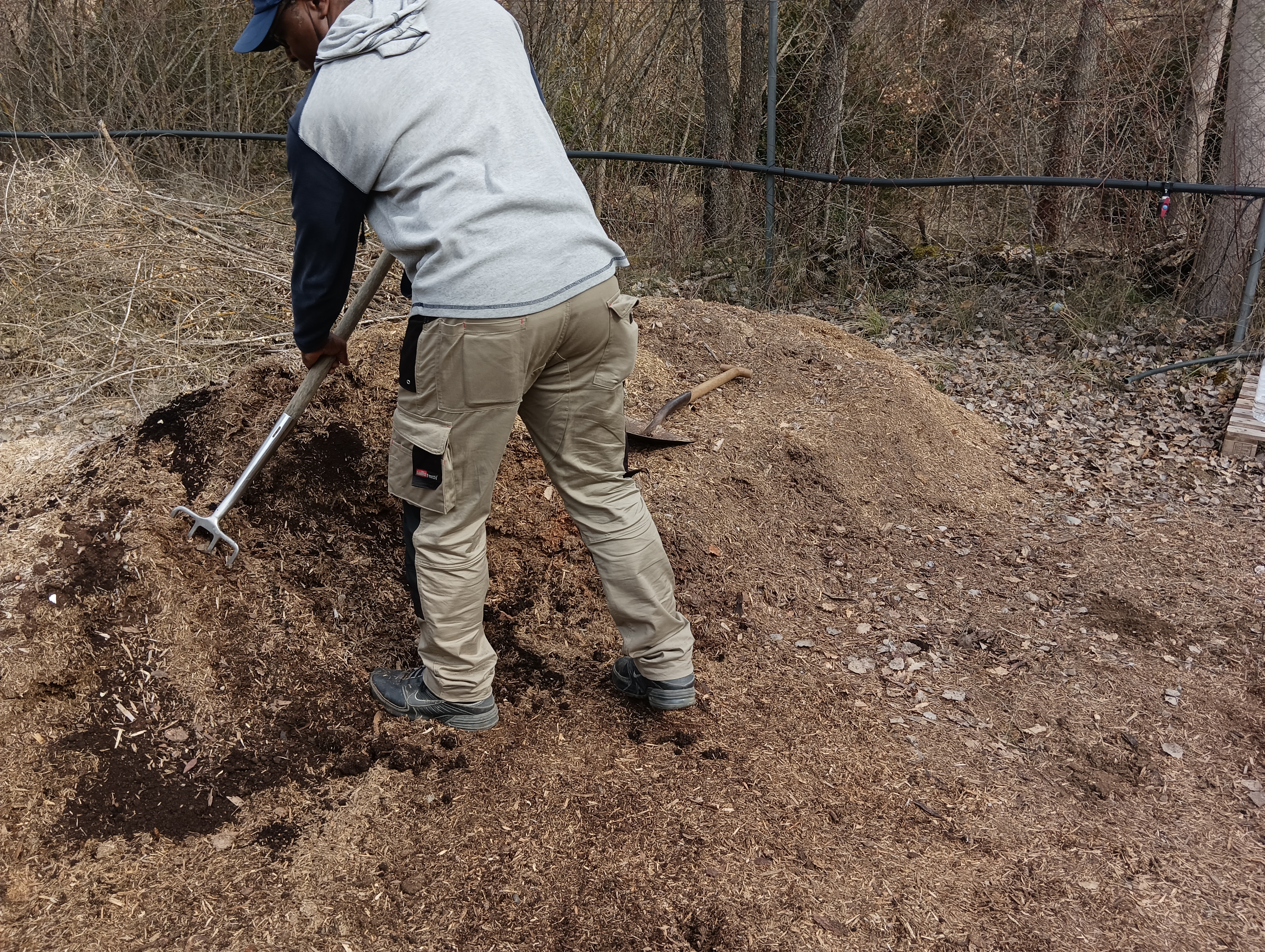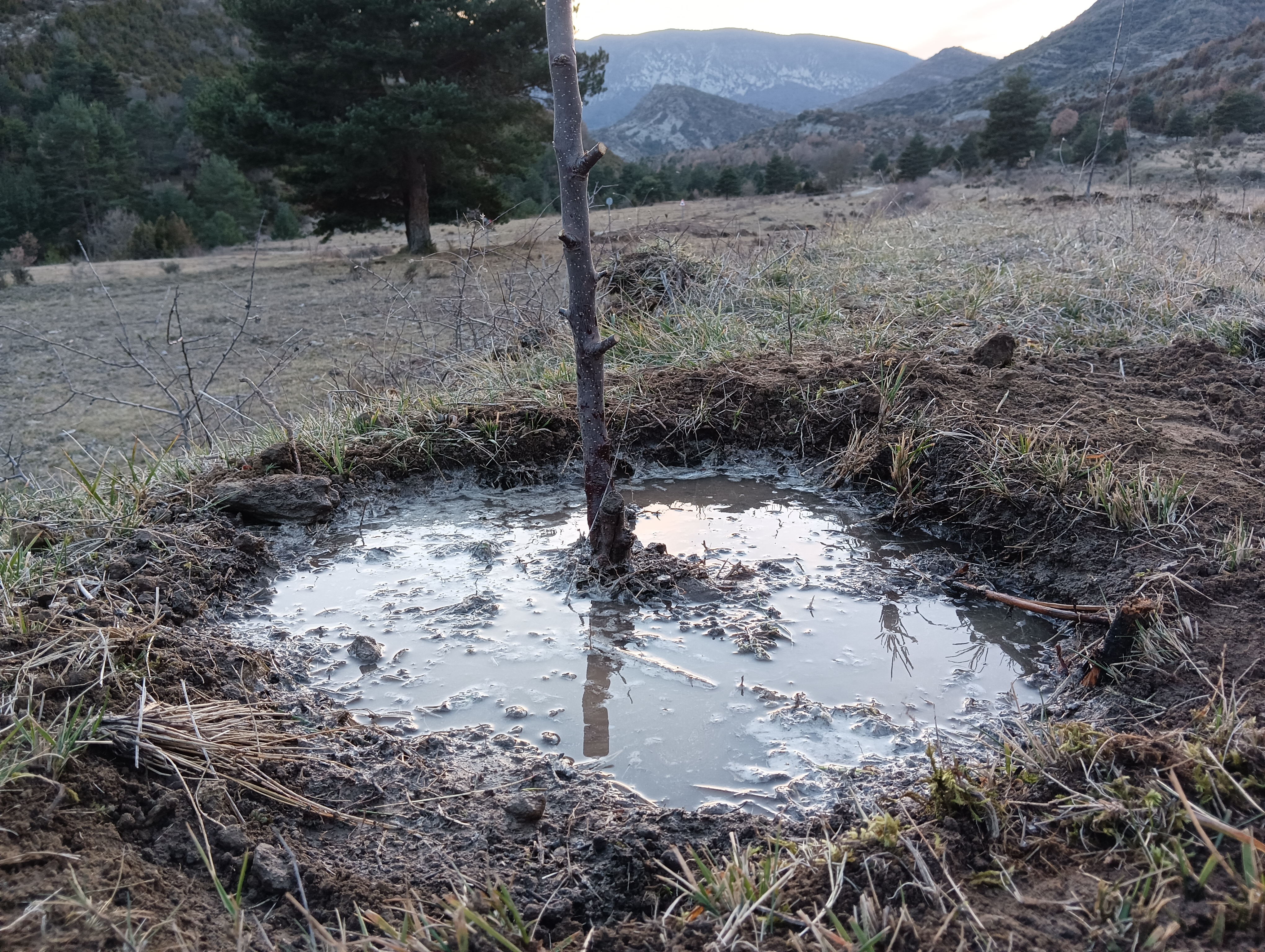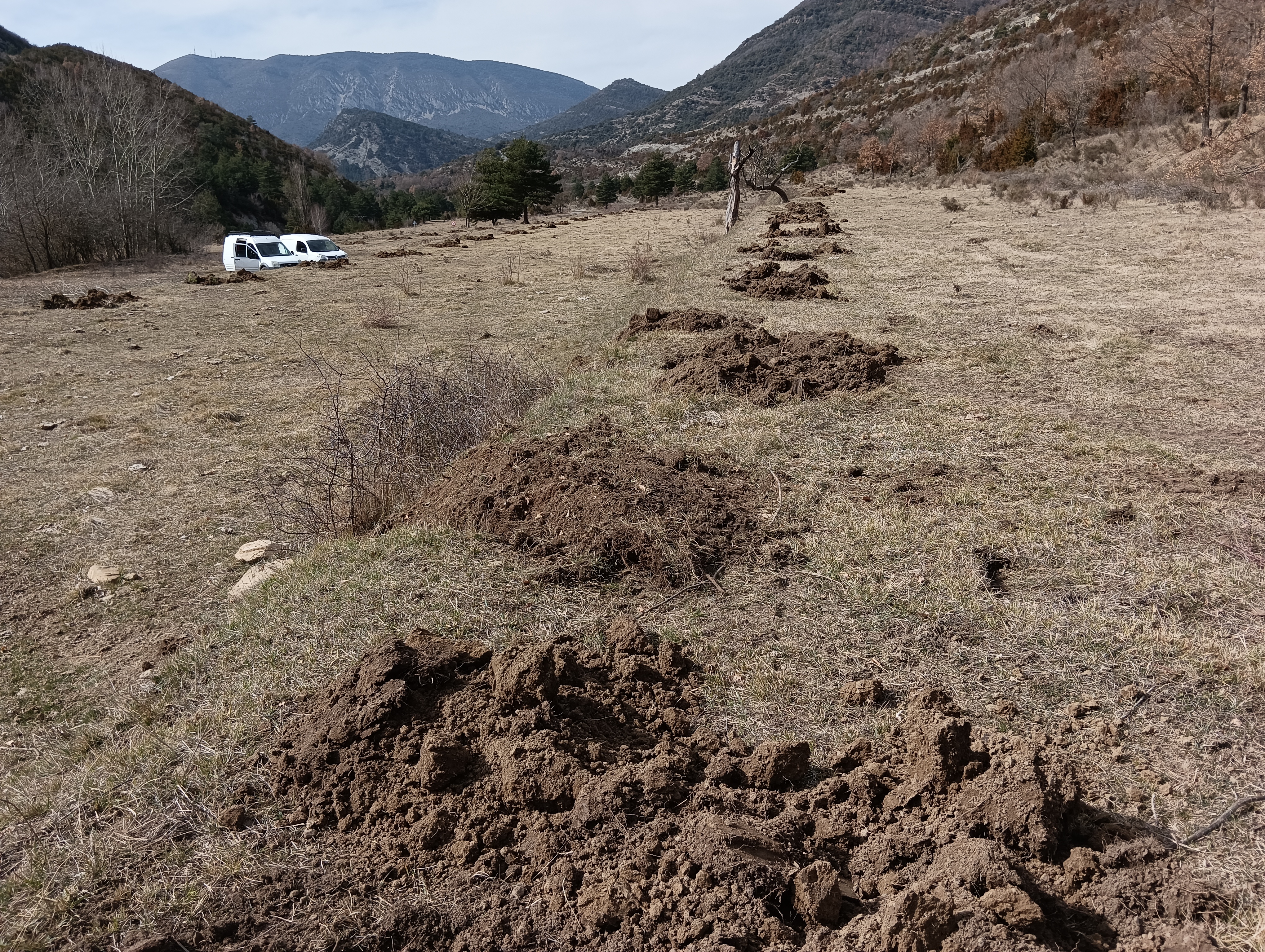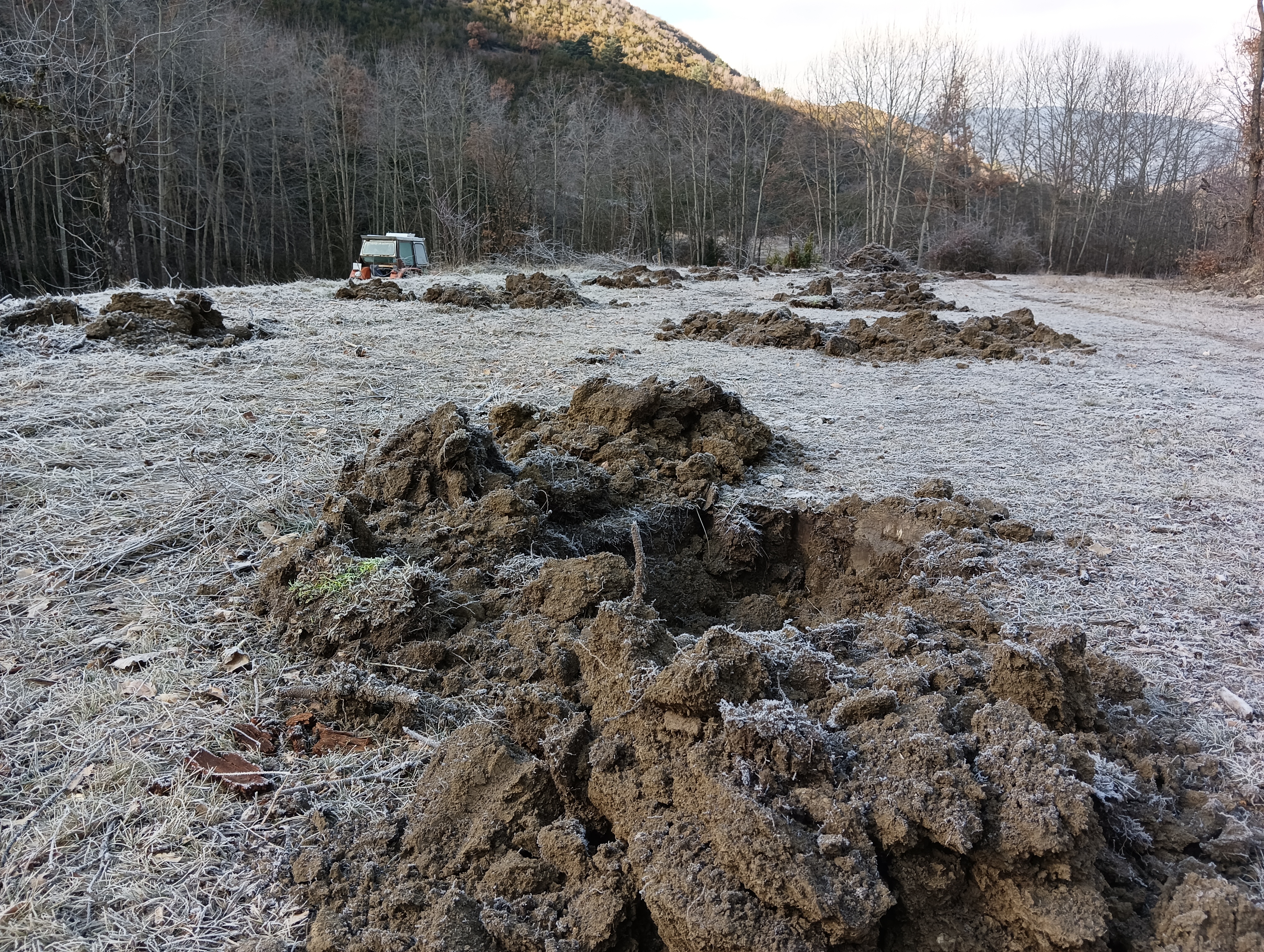 Usamos una máquina mixta para hacer los agujeros destinados a los nuevos árboles, y los empezamos a plantar. Los rellenamos con un compost especial, hecho a partir de heces de oveja, caballo y vaca, mezclados con restos triturados de material forestal. A la vez, incorporamos estiércol seco de vaca que íbamos encontrando a nuestro paso, ya que las vacas habían pastado por esta zona el año pasado.