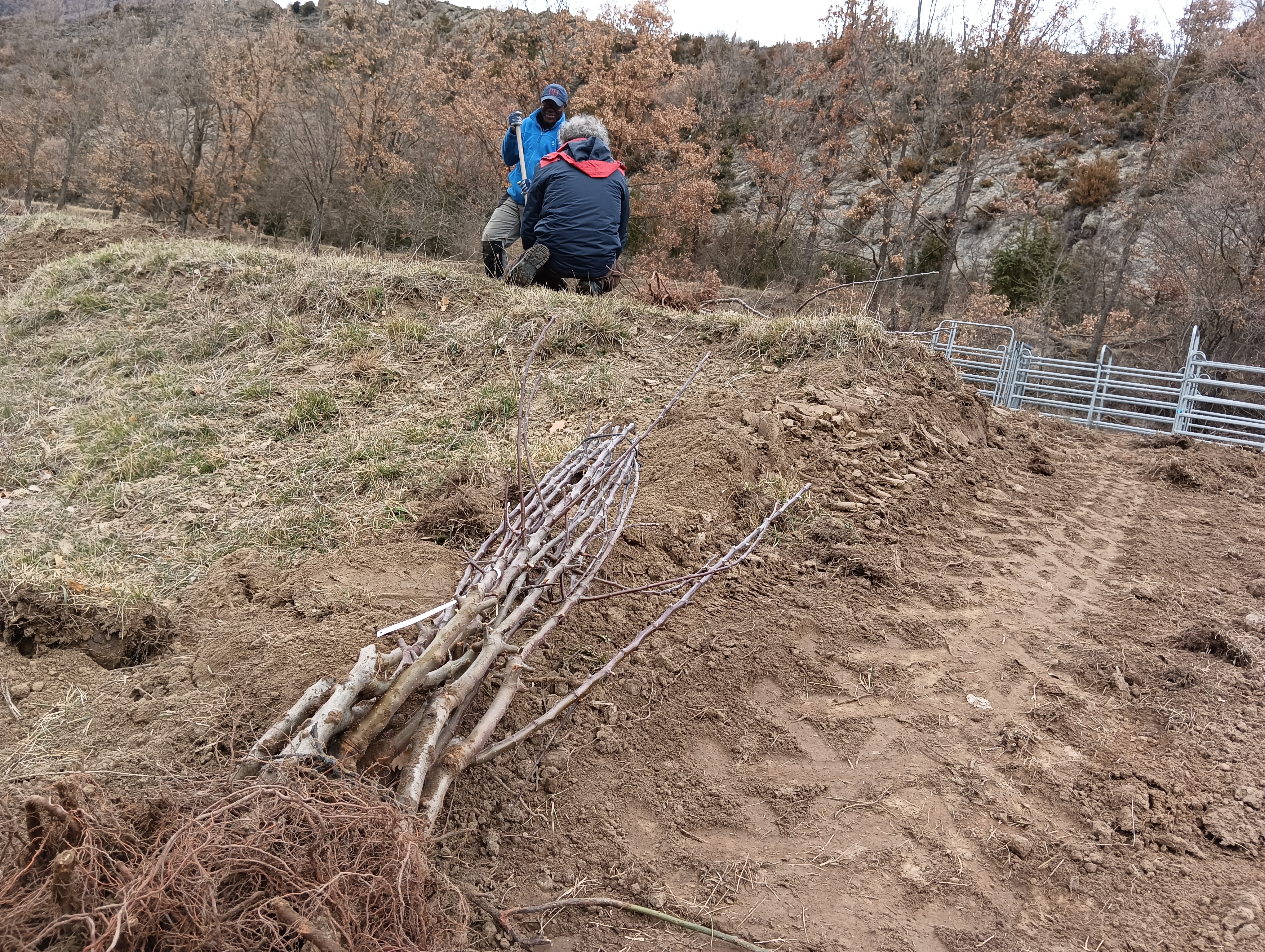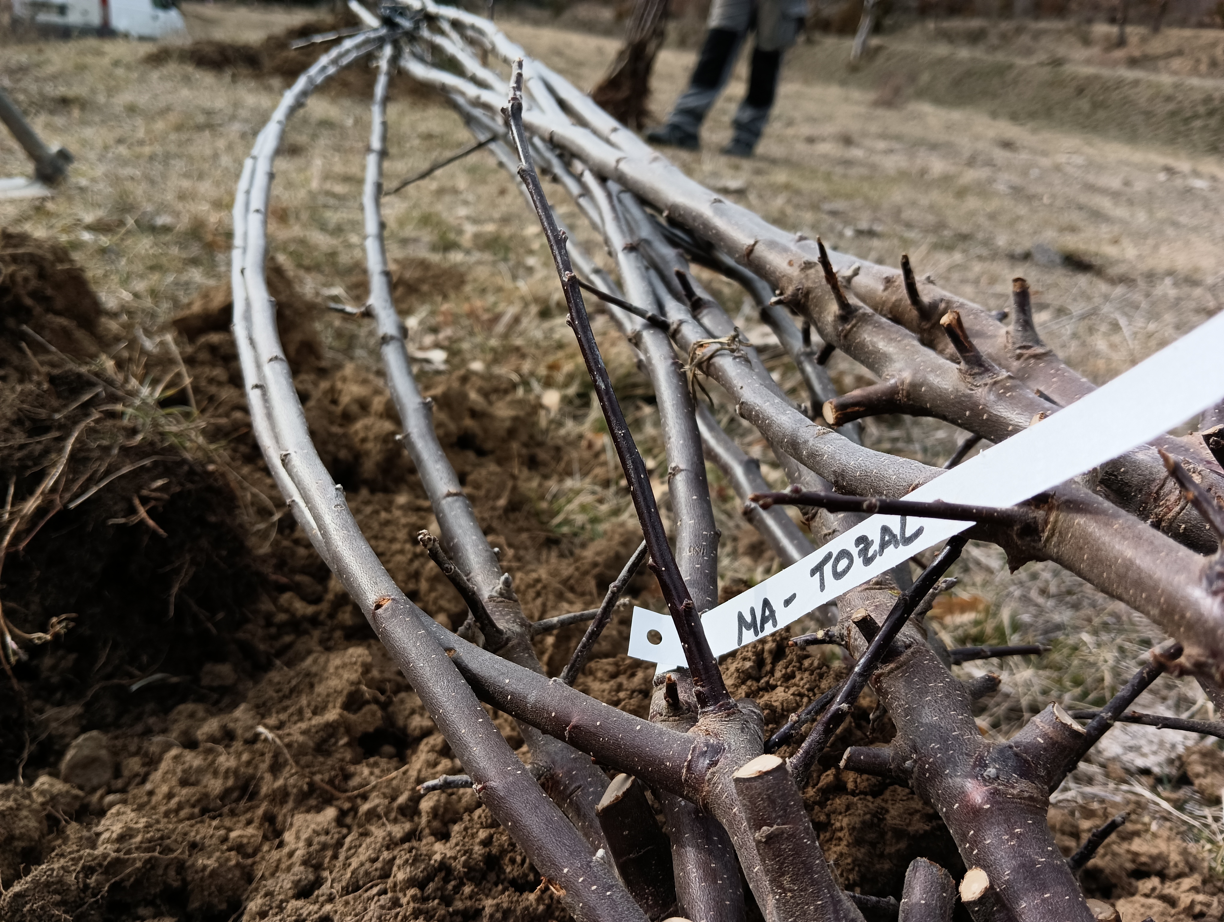 El pasado mes de febrero recibimos un centenar de nuevos frutales en Lúsera, injertados y aviverados para plantarlos en la finca de Guara.bio. Formamos parte de un programa de recuperación de frutales autóctonos impulsado por el CITA, junto con otros vecinos de la Hoya de Huesca y el Prepirineo.