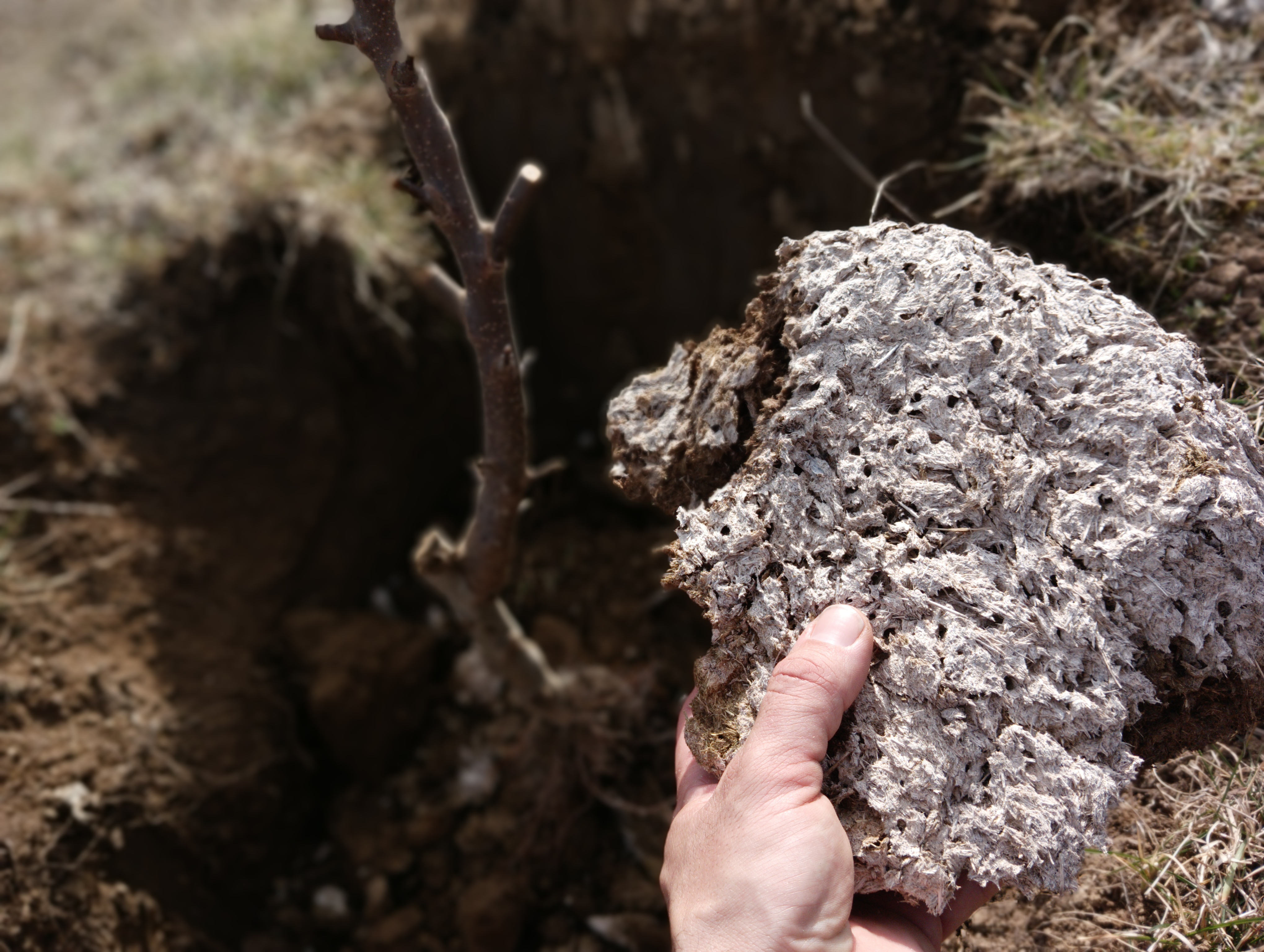Pasados unos días, protegimos el suelo donde plantamos estos nuevos frutales con una cobertura de paja ecológica triturada en la parte superior de los alcorques (hueco que rodea los troncos de los árboles a modo de tiesto). Como los árboles estaban en parada vegetativa, y estábamos en temporada de heladas, era el mejor momento para hacerlo. Asimismo, escogimos hacerlo durante la luna menguante de enero.