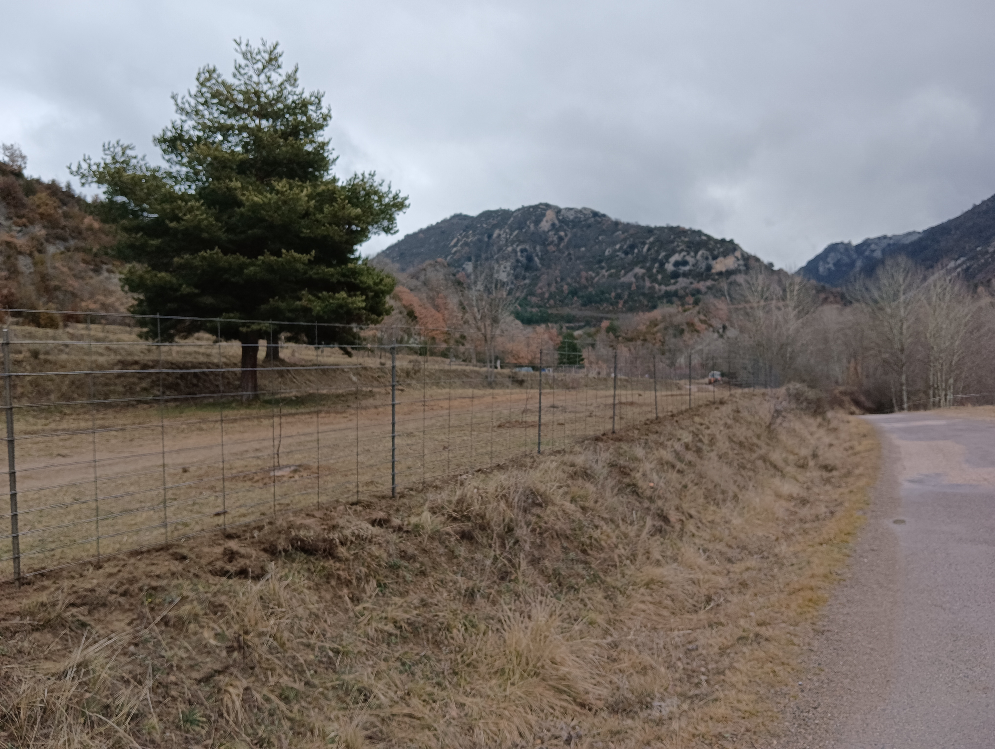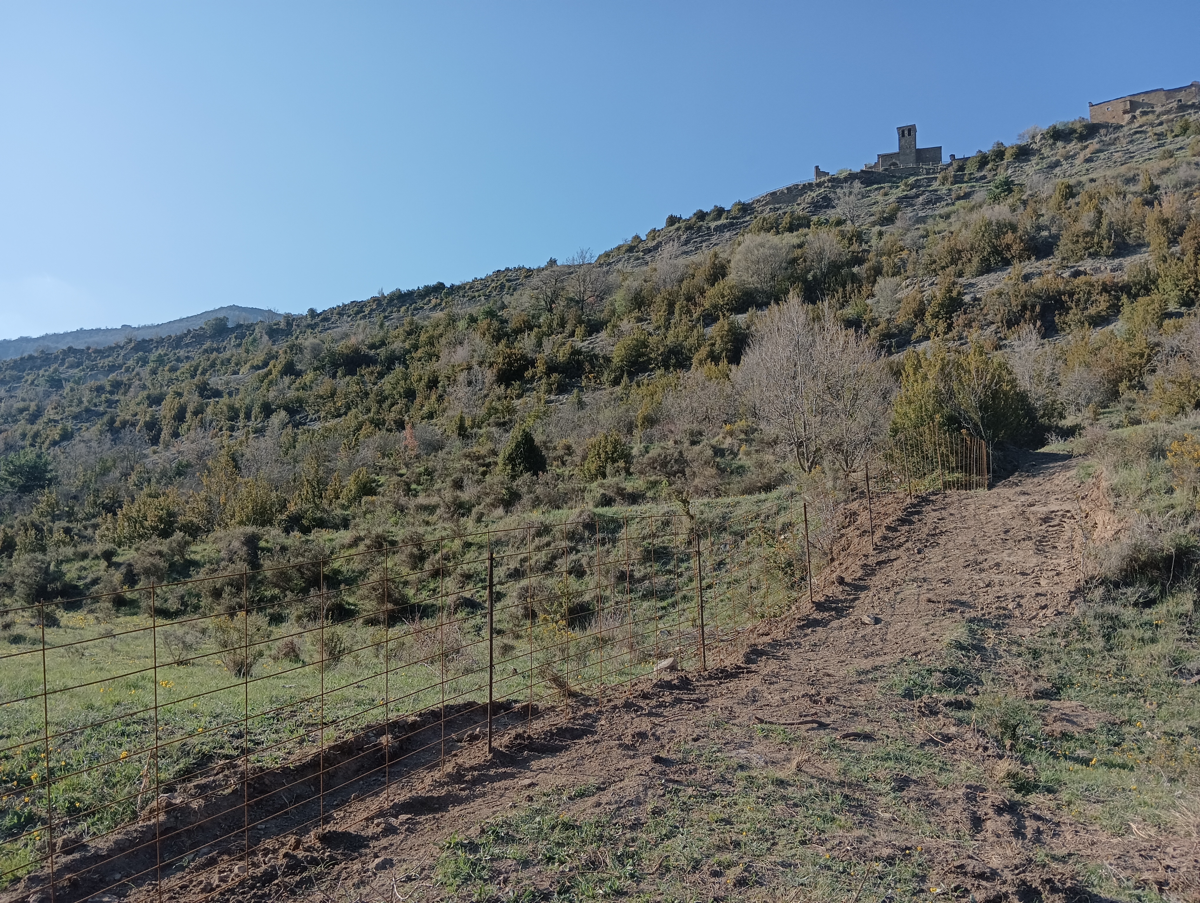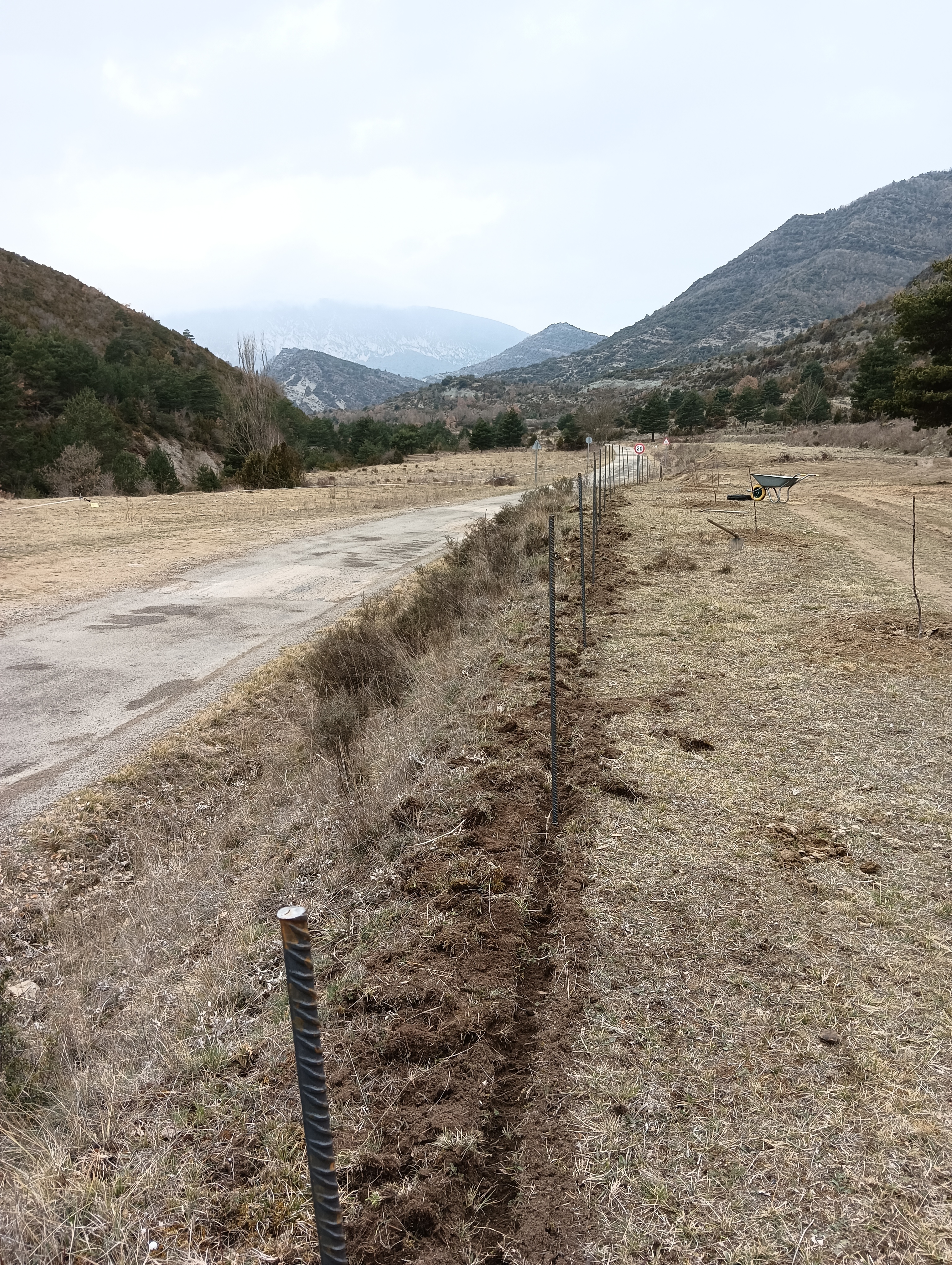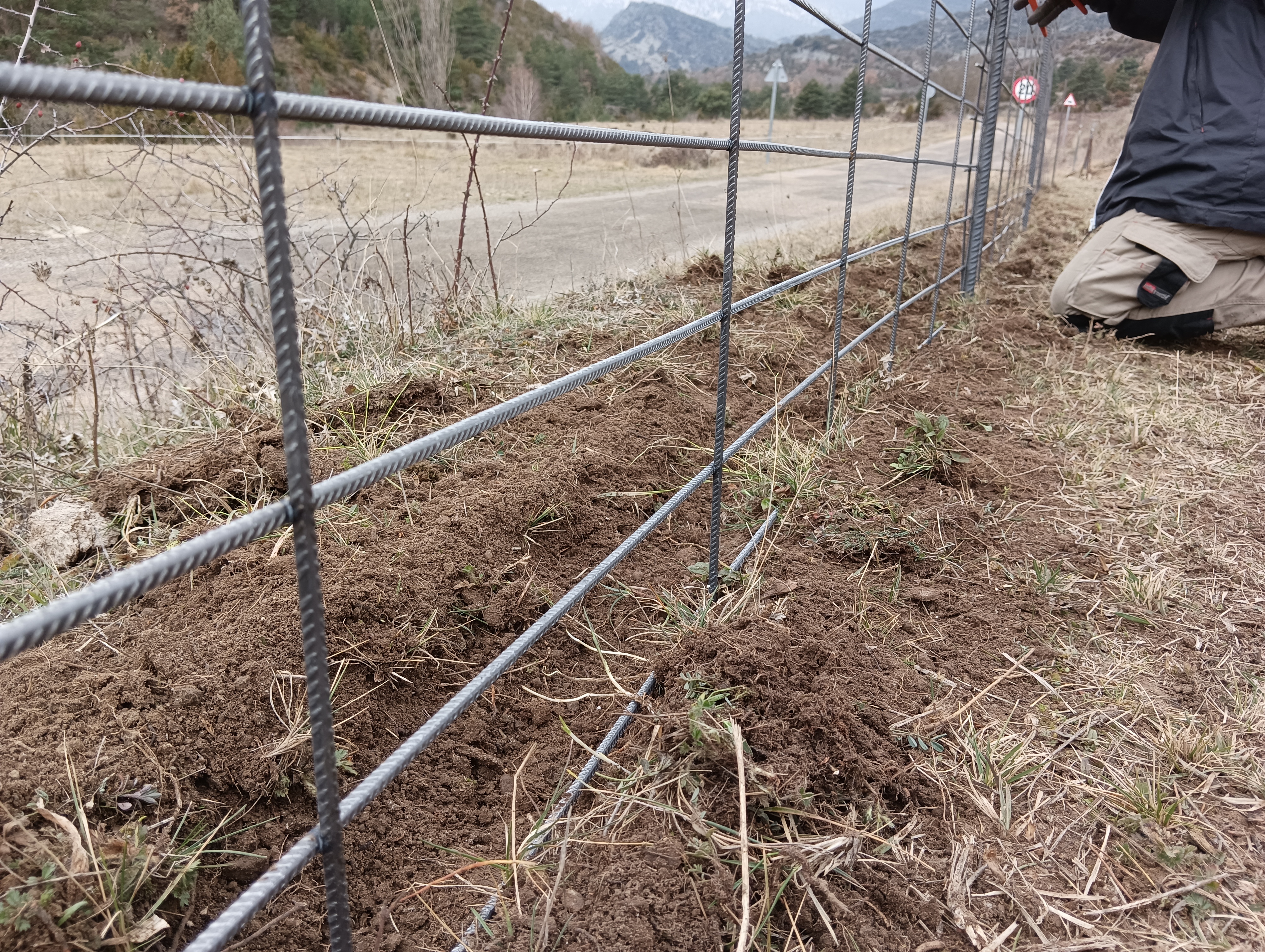 Hemos protegido nuestras nuevas plantas con un cercado, que impedirá el paso de animales silvestres como el corzo, la cabra montés o el jabalí. Estos animales, movidos por la viveza de estas plantas no tardarían producirles daños irreversibles en corteza y hojas cuando comienza el periodo vegetativo de estos frutales. Buscan savia fresca, y los jabalís también estropean las raíces cuando rebuscan en el suelo. También impedirá que nuestras vacas se introduzcan en el nuevo huerto. El perímetro estará protegido con una cerca móvil de hierro anclada al suelo con postes de rea cada 3 metros, con anclajes intercalados en forma de U. Además, hemos hecho manualmente una pequeña zanja para anclar bien los paneles de mallazo ganadero.