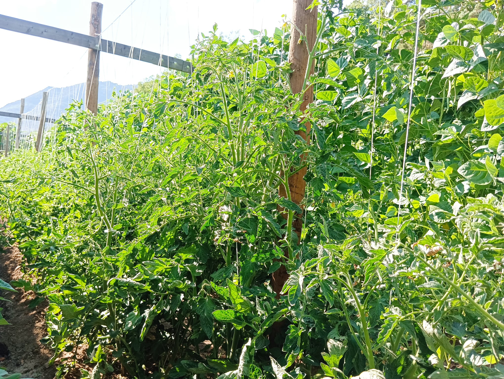 Después vemos tomate rosa de Rañín, que este año no hemos podado tanto para que crezca un poco más natural. Y parece que es bueno para las plantas, están más sanas.
