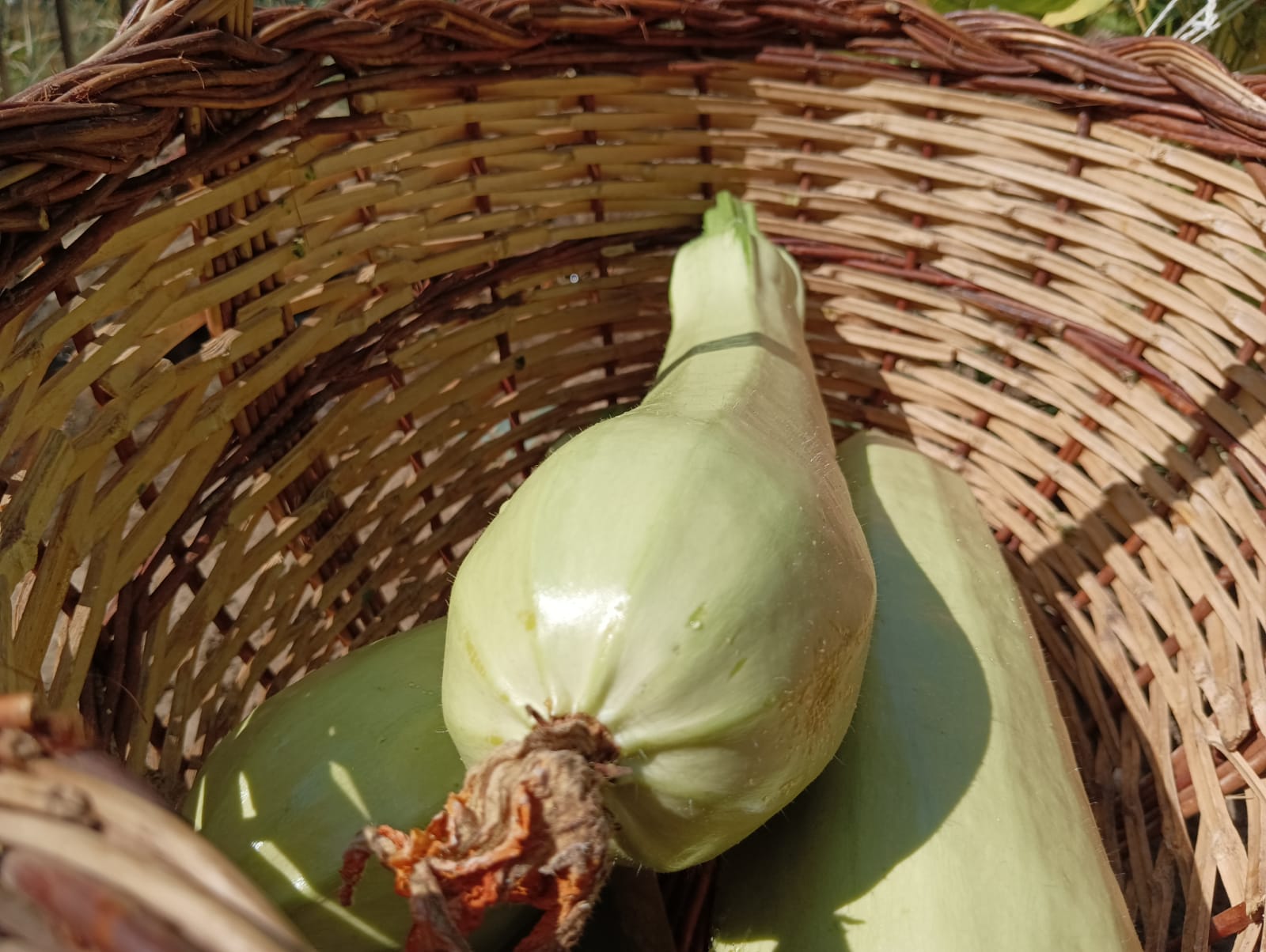 Después encontramos los pepinos cortos y los calabacines blancos de Panzano. Nos comenta Adrián que, aunque no son variedades muy productivas, este año están cuajando mejor las flores gracias a los abejorros que viven aquí. Por eso tenemos algunos calabacines bien grandes.