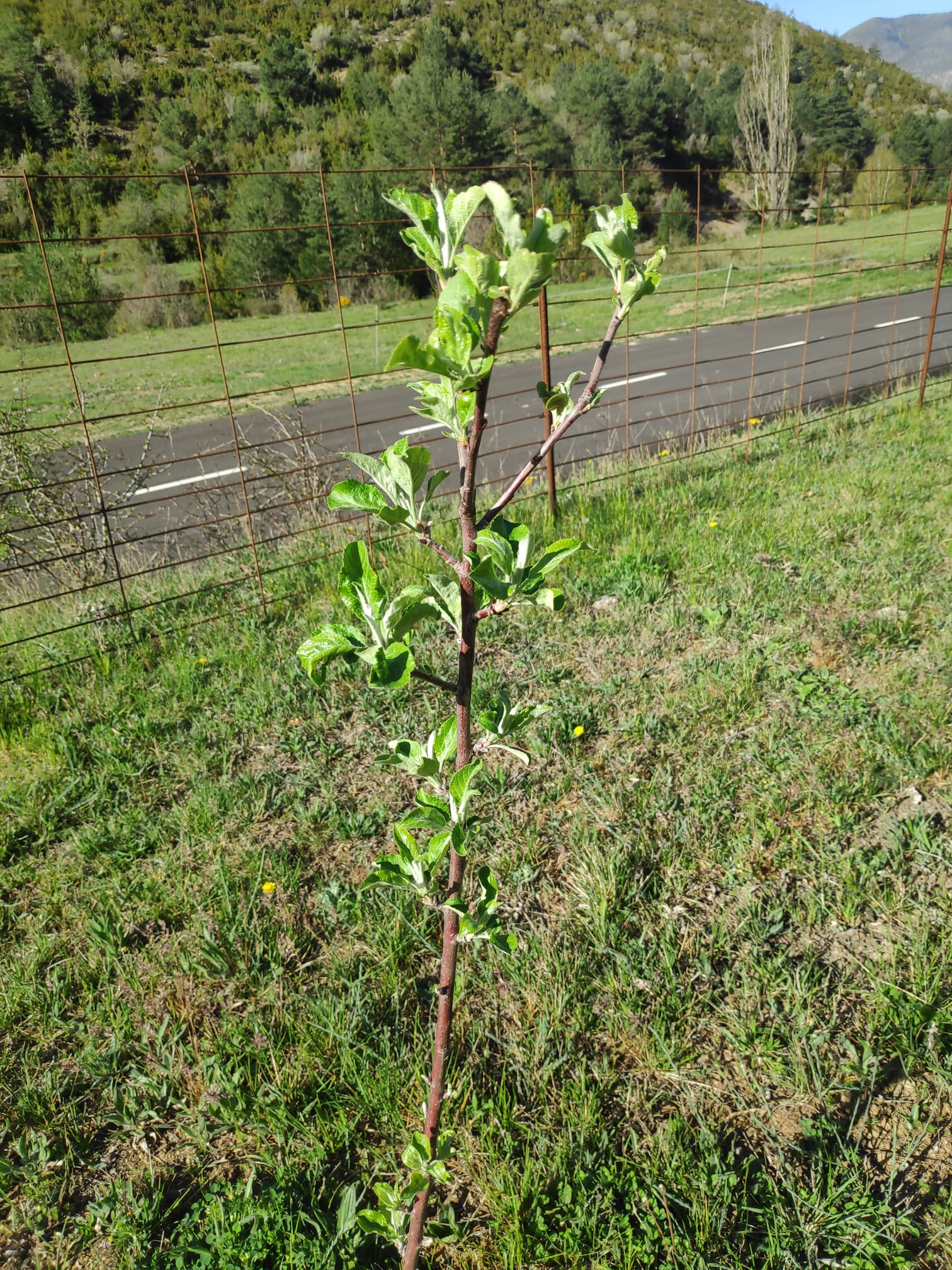 Los manzanos de variedades autóctonas que pusimos el año pasado se han podado en marzo y ya han brotando. Fue necesario regarlos porque el mes de mayo no llegó la lluvia, que era tan necesaria.