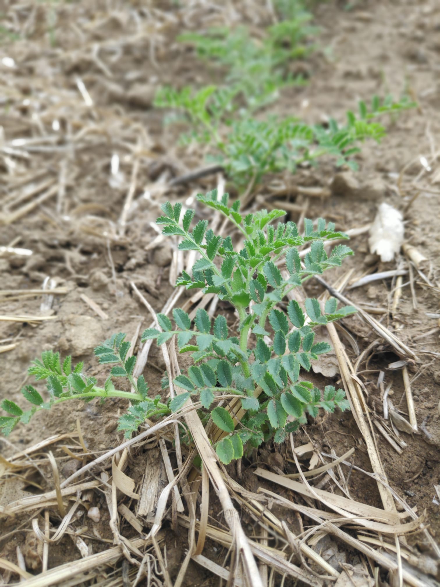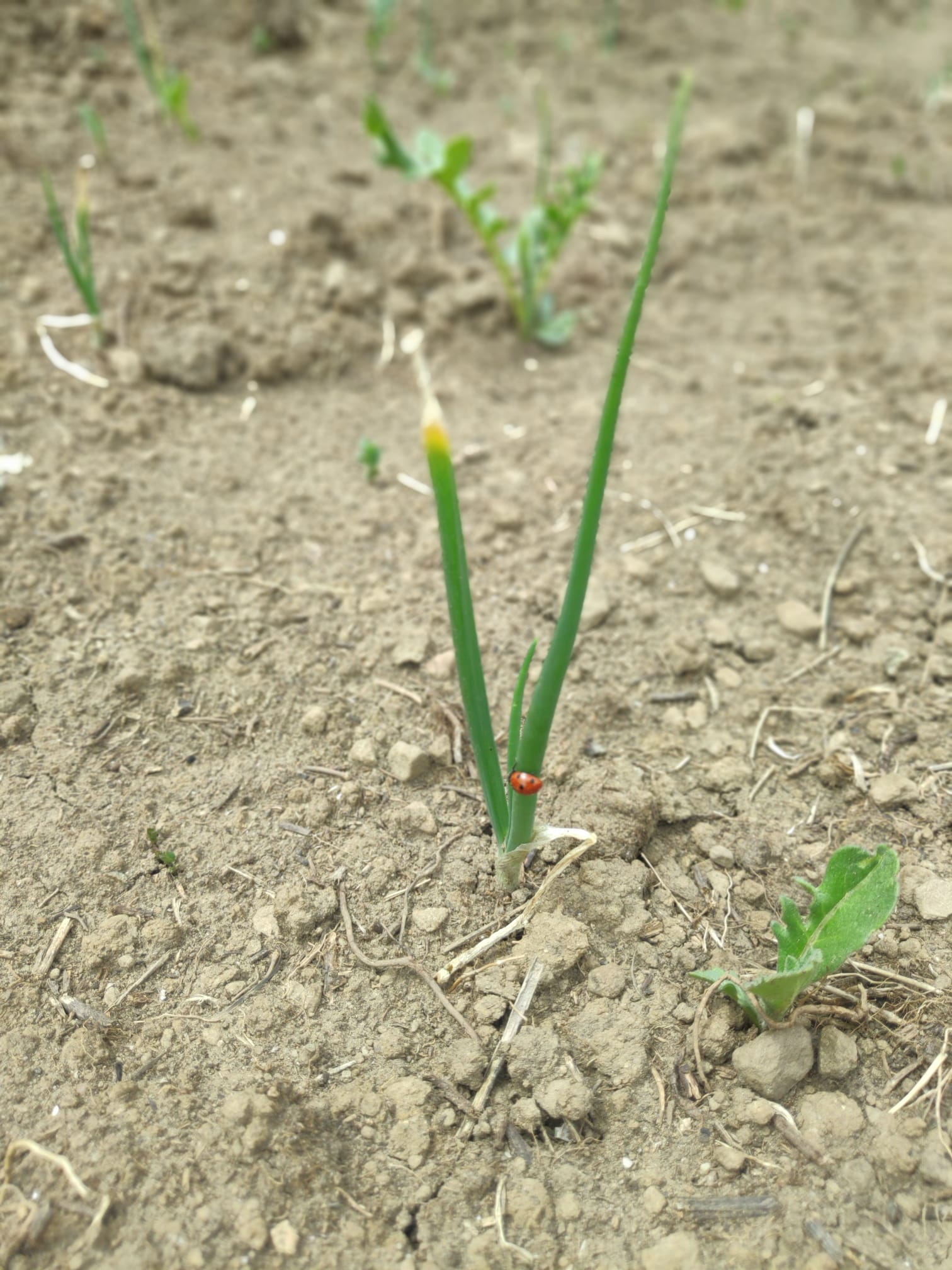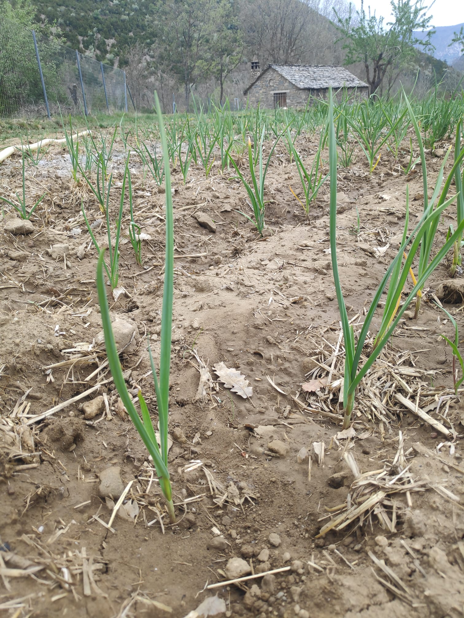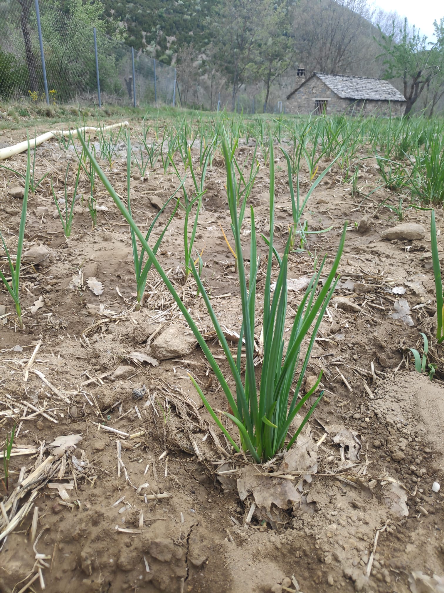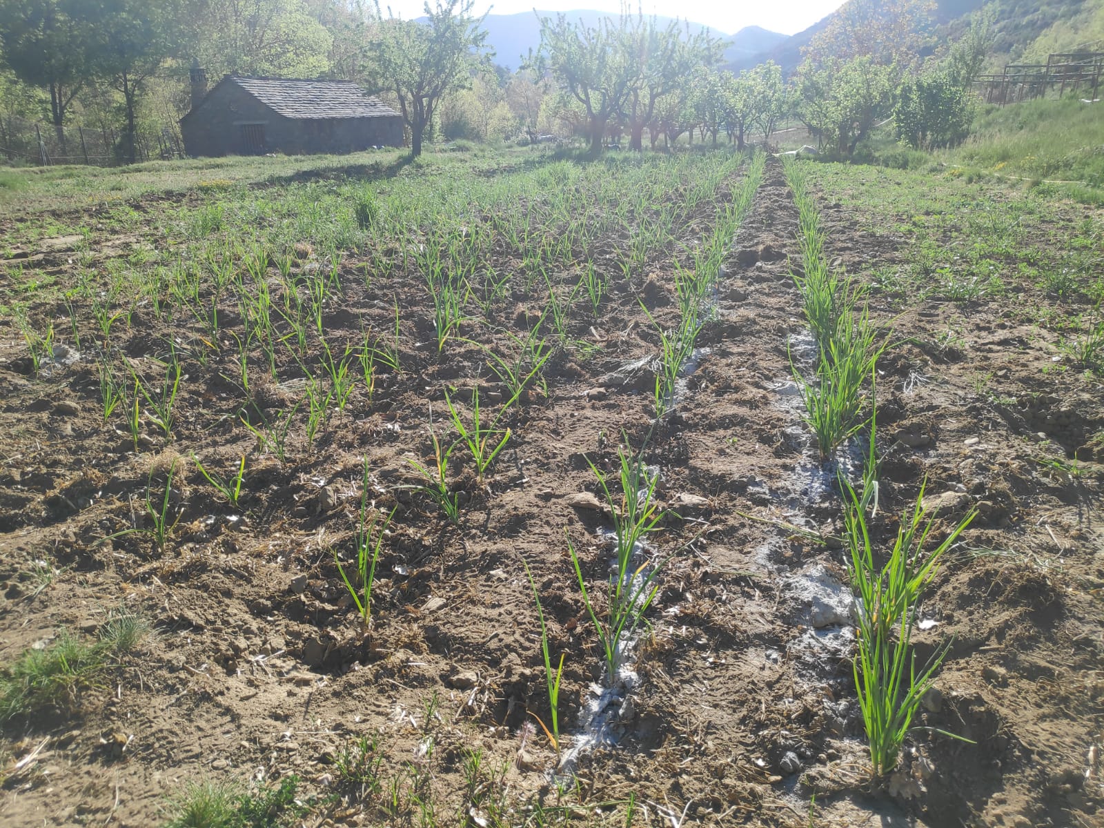Este año hemos plantado ajos tiernos y ajos morados, de la cosecha del año pasado. También hemos plantado una simiente de garbanzo procedente de Luesia para ver qué tal se da en Lúsera. Como la guija, son especies que estamos poniendo este año para probar, a modo de test, para comprobar su capacidad de adaptación al clima y al suelo, y su rendimiento. En las fotos ves las cuatro especies en el orden en que las hemos mencionado.