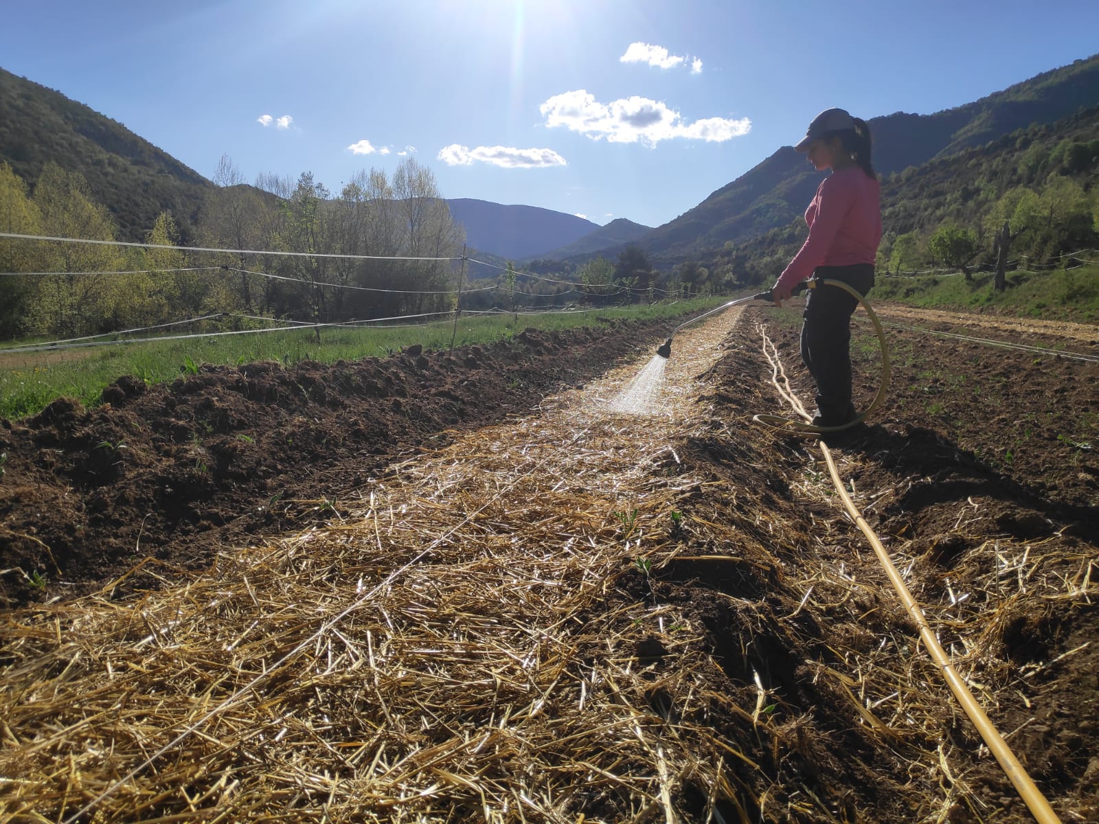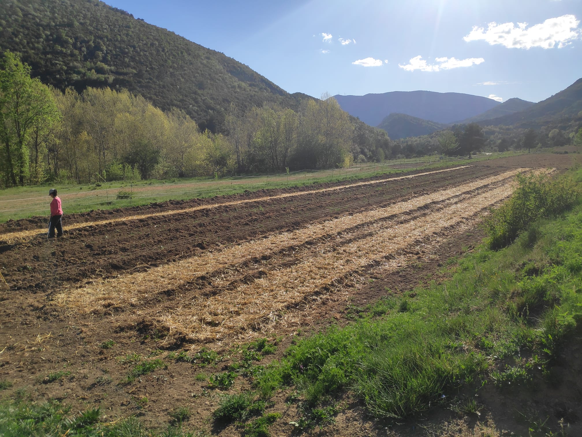 Ponemos la planta en los bancales, le damos unos días para que agarre y la regamos. Cuando ha agarrado y hemos dejado secar un poco la tierra, “maigamos” la tierra, es decir, se entrecava sin profundizar demasiado para quitar las hierbas y oxigenar la tierra. Después le aplicamso abono verde e incorporamos un abono ecológico que contiene mucha materia orgánica y el año pasado nos dio muy buen resultado y a continuación lo cubriremos todo con una capa de paja.
