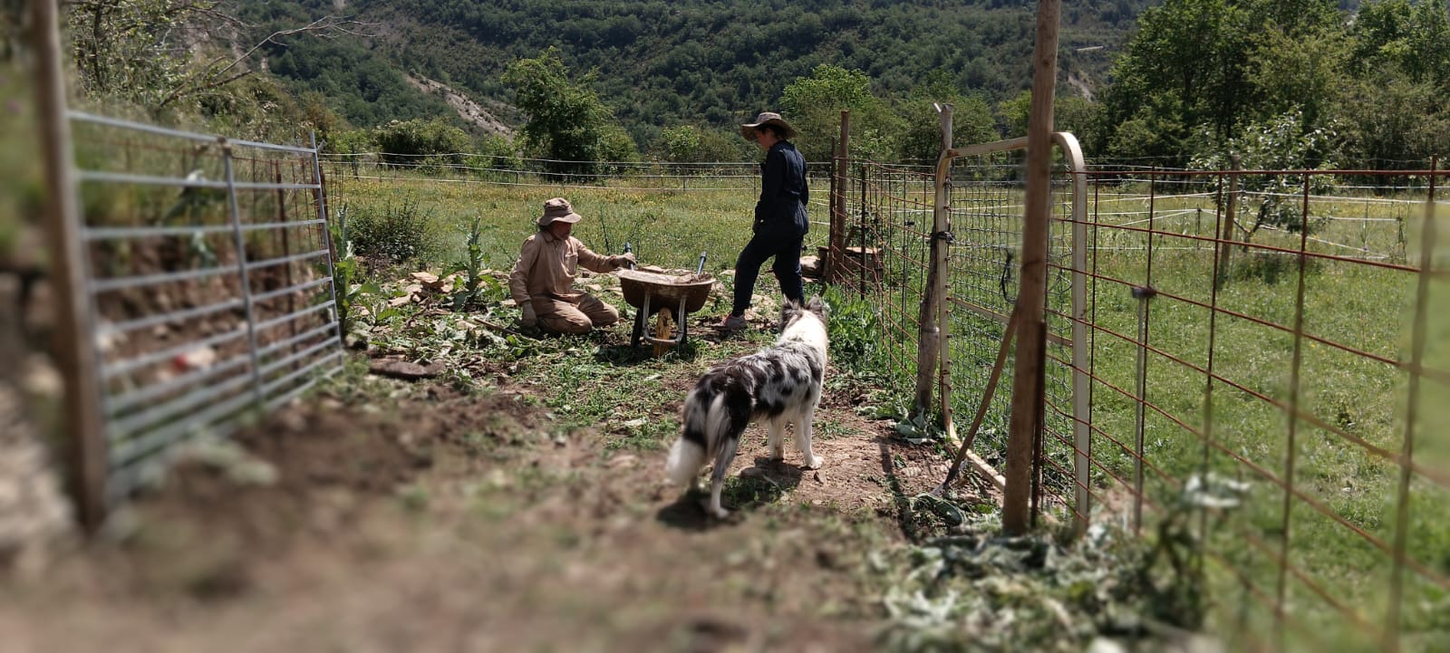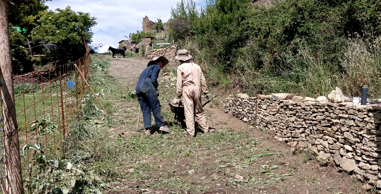 Eva, una encantadora voluntaria de Barcelona, se nos ha unido este mes con su perro, LLop. Nos está ayudando en los trabajos de limpieza y en la reconstrucción de los muros de piedra seca que dan acceso a las parcelas de plantas medicinales. Comparte su entusiasmo y su amor por la naturaleza con nuestro vecino Miguel, un experto en jardinería y producción ecológica que hace unos años compró una casa en Lusera y nos ayuda y visita a menudo.