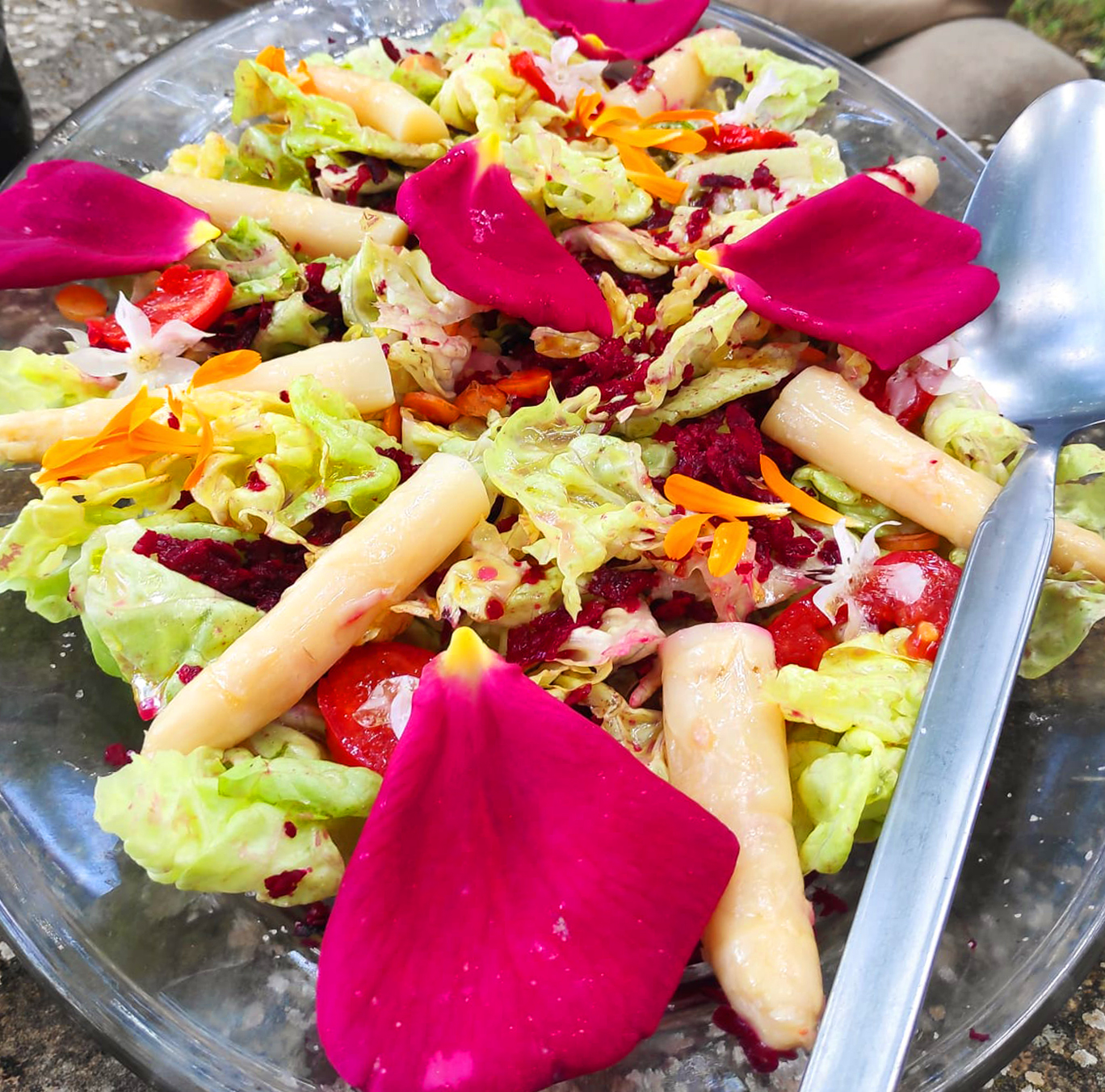 Finalmente, para celebrar todas estas maravillosas noticias, nos hemos reunido todos para compartir una comida deliciosa. Hemos disfrutado de un guiso de puchero a base de judías verdeñas con calabaza, acelga y pimiento choricero. Además, hemos preparado una ensalada con nuestras primeras lechugas, remolacha, espárragos, tomate cherry y, para darle un toque especial, lo hemos decorado con unos pétalos de rosa. Fue un momento de alegría compartida disfrutando de los frutos de nuestro trabajo.