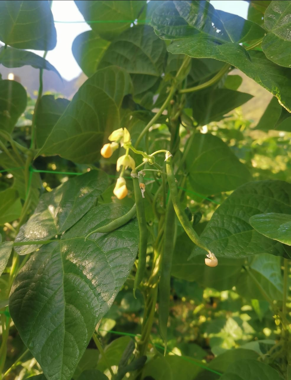 La judía verde se desarrolla a partir de una delicada flor, en esta variedad de color blanco, que contiene tanto órganos masculinos (estambres) como femeninos (pistilos), lo que permite la autopolinización. Entonces, los pétalos de la flor comienzan a marchitarse, y el ovario dentro de la flor se transforma en la pequeña vaina que veis, la primera etapa de la judía verde.