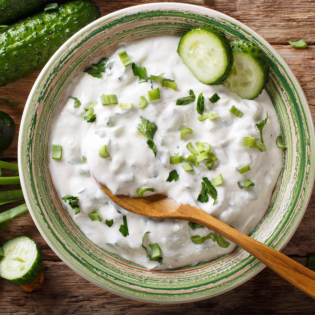 También puedes hacer un tzatziki: pela un pepino, quita la parte central con las semillas, pícalo o rállalo, échale sal y déjalo reposar media hora o más en un colador (escurrirá el agua); Después haz una mezcla con dos yogures griegos, un diente de ajo picado, una cucharadita de perejil y otra de eneldo picado, un chorro de limón, otro de aceite de oliva, otro de limón, sal y pimienta.