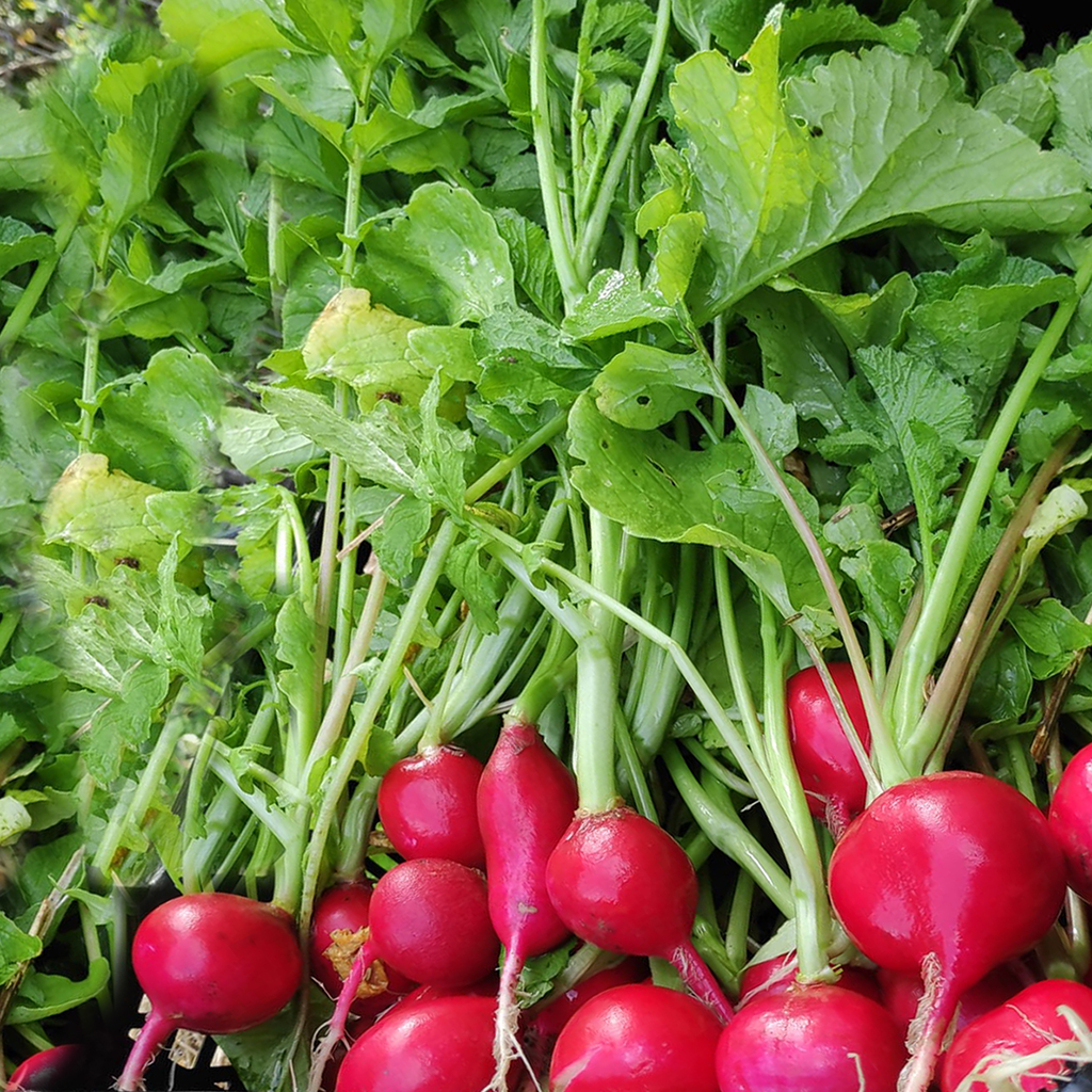 Cultivamos estos rabanitos, Raphanus sativus, al igual que sus primos de punta blanca, por sus llamativas raíces. Rojo por fuera, muy redondo, del tamaño de una pelotita de ping pong y radiantemente blanco por dentro, es refrescante, ligeramente picante y muy crujiente.