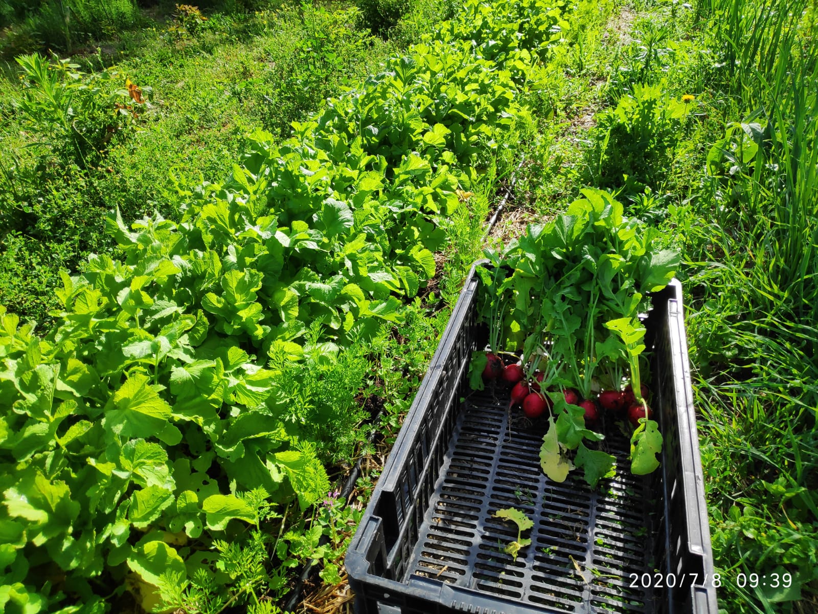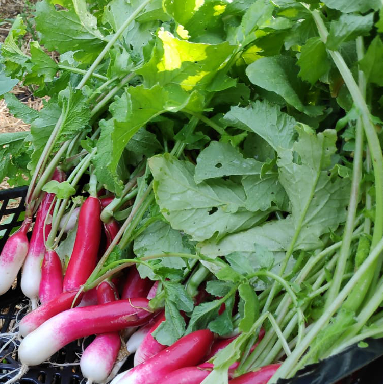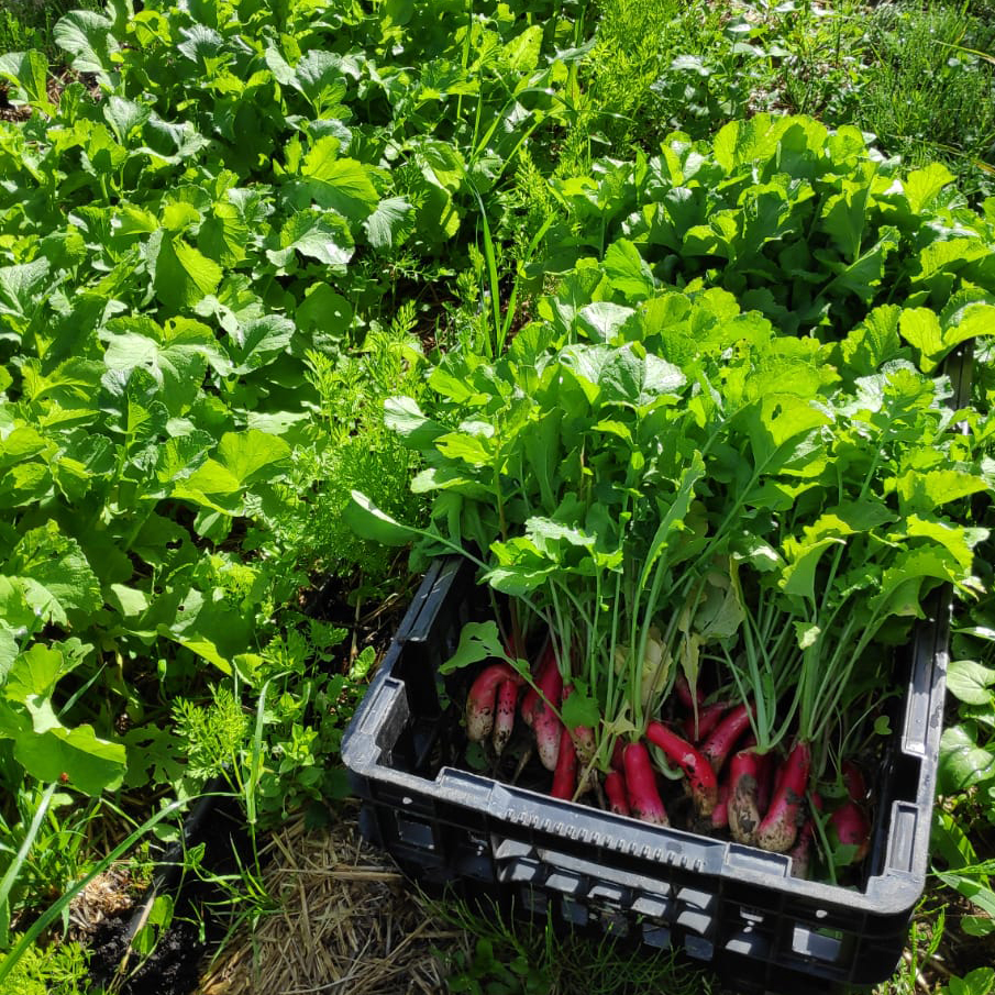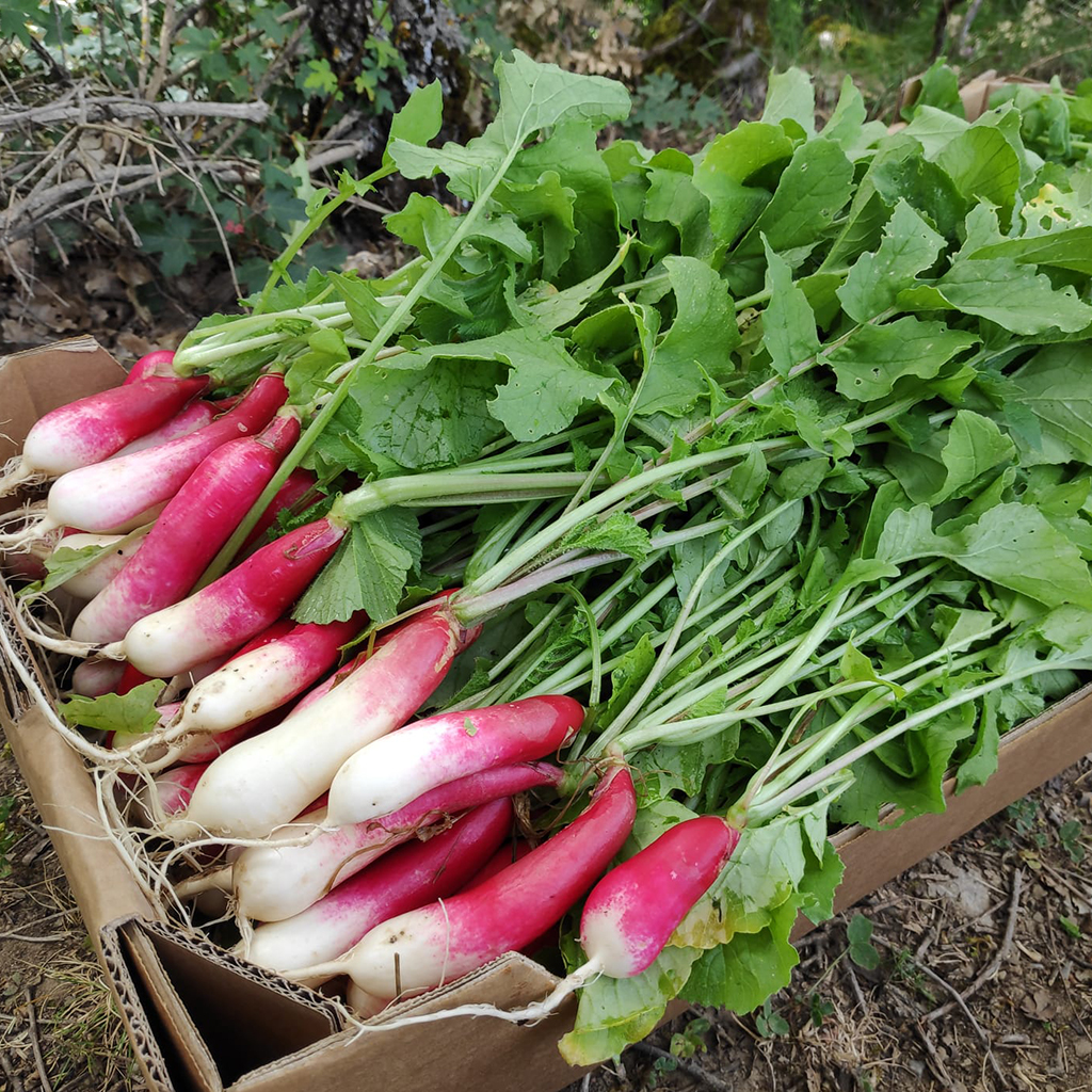 Cultivamos estos frescos y coloridos rabanitos, Raphanus sativus, por sus llamativas raíces. Rojo por fuera y blanco por dentro, refrescante, ligeramente picante, crujiente… con su colorido vivo alegra nuestras ensaladas.
