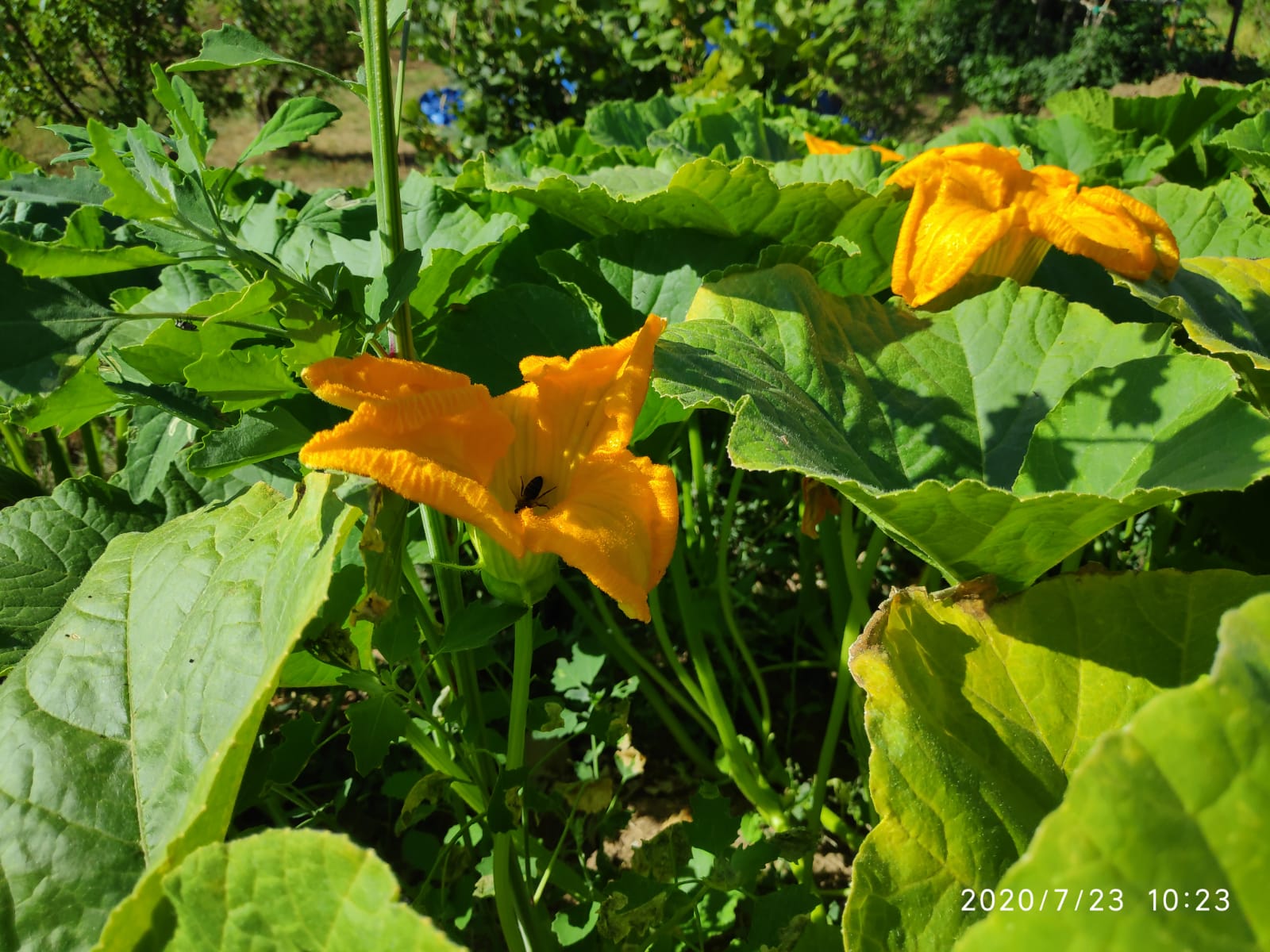 En la misma mata hay flores masculinas y femeninas (las de la parte superior), por lo que el trabajo de las abejas es imprescindible para polinizarlas. En Lúsera, donde no utilizamos pesticidas ni químicos, afortunadamente tenemos muchas abejas, y en consecuencia, ¡muchos calabacines!