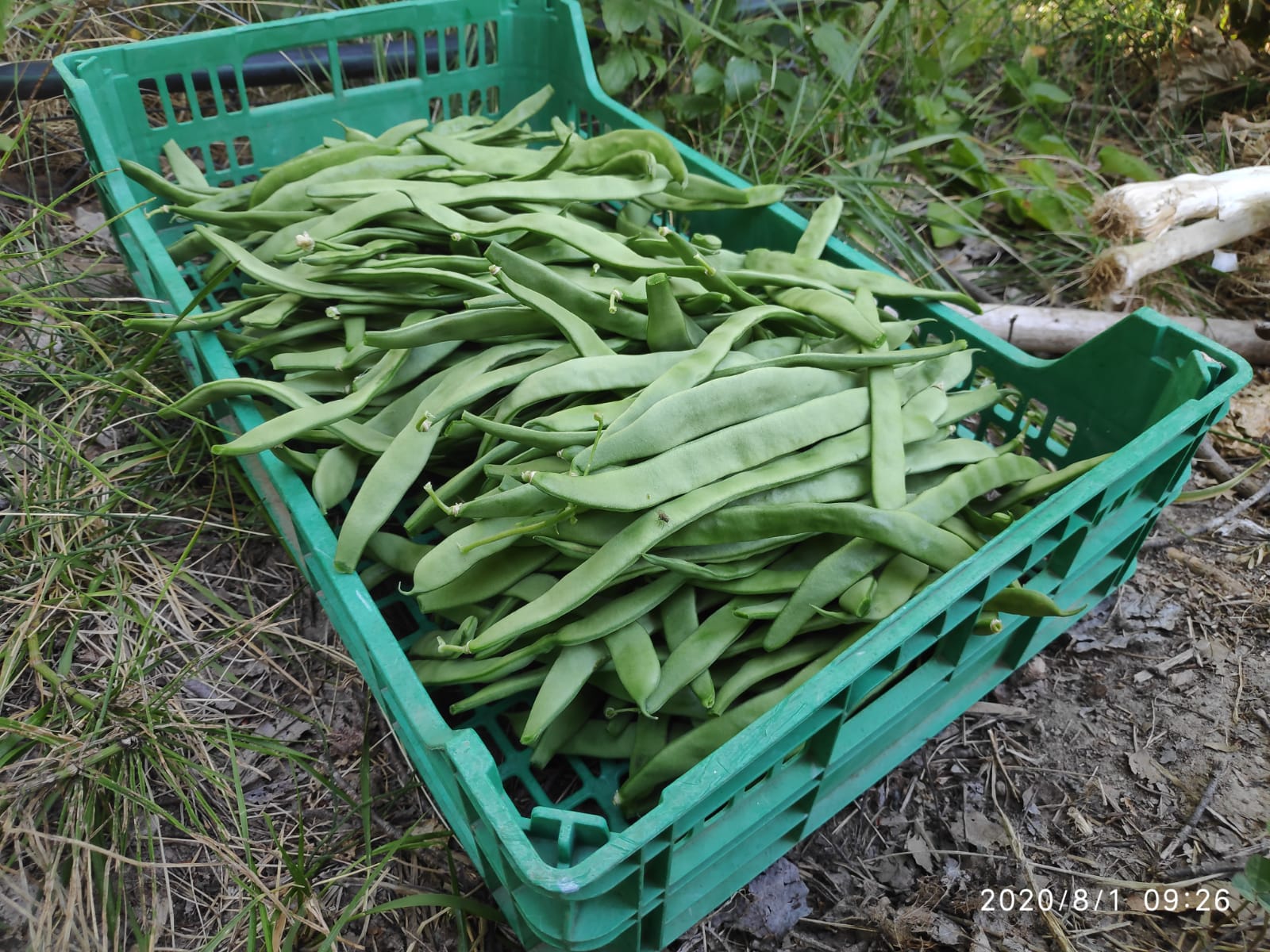 Las hemos sembrado en primavera y es a final de verano, unos 3 meses después, cuando podemos empezar a recolectarlas. Lo hacemos con mucho cuidado para no dañar las ramas, las vainas y las flores más tiernas durante el proceso. Así podremos seguir cosechando judías para llevártelas a casa hasta septiembre.