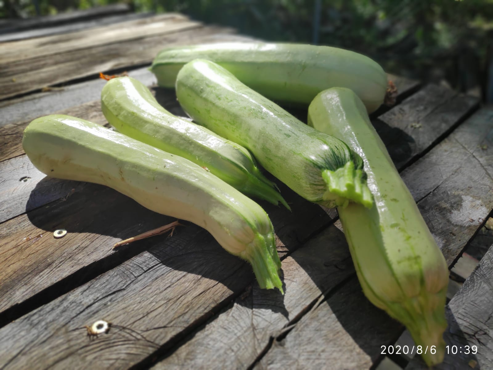 Estos calabacines de color verde blanquecino (variedad clarita) son muy productivos. Tienen una longitud de unos 20 cm y resultan muy finos. Es la hortaliza por excelencia del verano ya que al altura a la que nos encontramos, es a finales de julio o principios de agosto cuando comienza la cosecha.